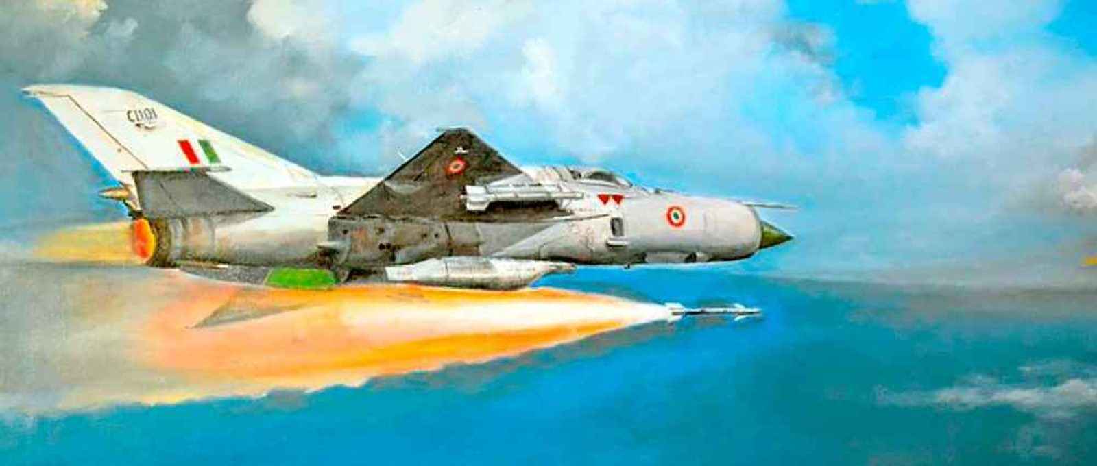 Um MiG-21 da IAF disparando míssil sobre o mar (Ilustração: Deb Gohain/Pinterest).