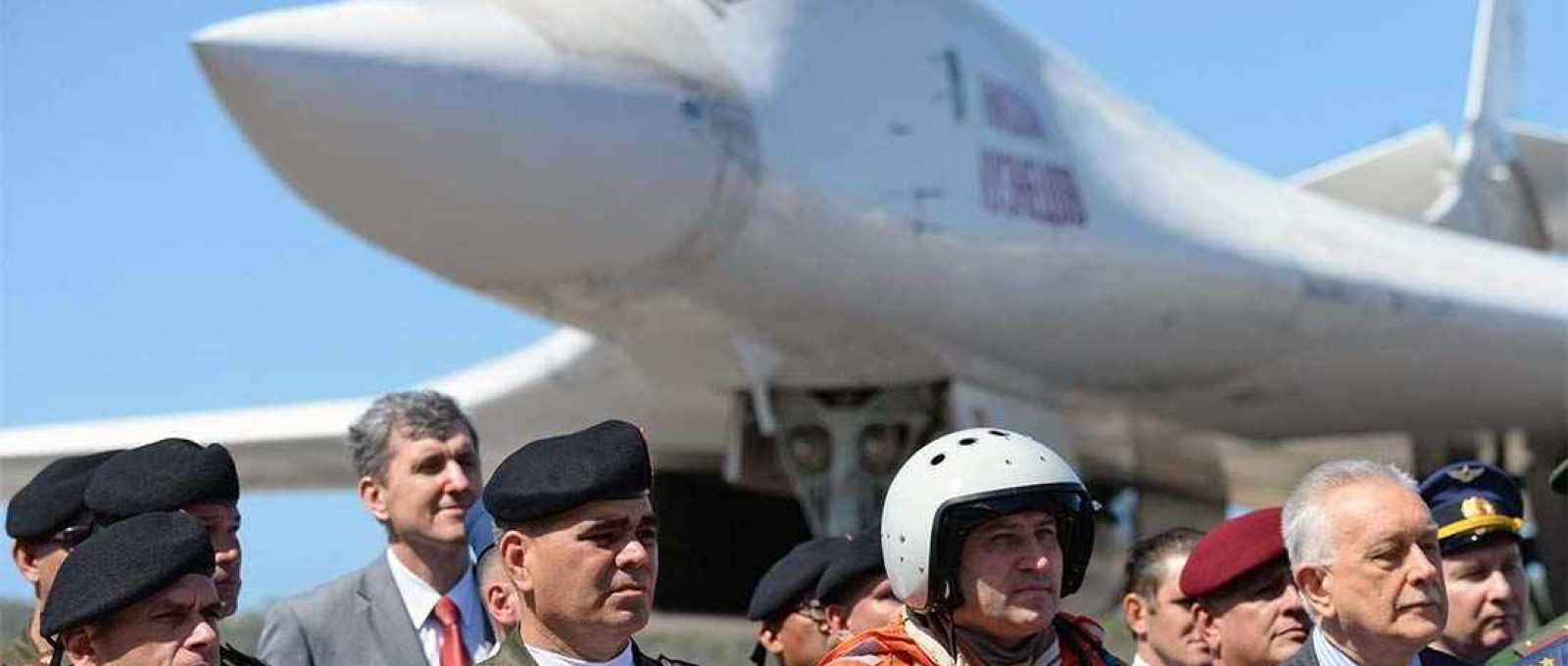O ministro da Defesa venezuelano, Vladimir Padrino (com uniforme do Exército), é fotografado recepcionando a chegada de bombardeiros estratégicos Tupolev Tu-160 da Rússia no Aeroporto Internacional Maiquetía, ao norte de Caracas, em 10 de dezembro de 2018 (Federico Parra/AFP/Getty Images). O perigo real não é Moscou desdobrar forças no país,…