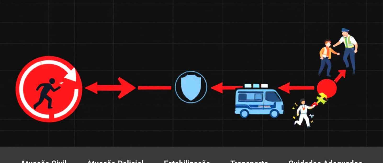 A Cadeia de Sobrevivência em ataques ativos foi desenvolvida para estruturar a resposta a esses incidentes de maneira eficiente, conectando cinco fases ou elos interdependentes: resposta civil, resposta policial, estabilização, transporte e cuidados definitivos.