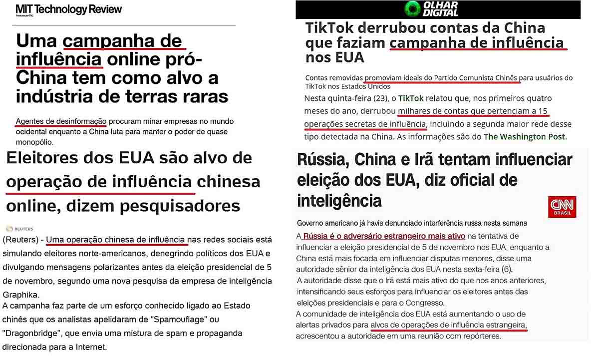 A mídia leiga, por vezes, alerta para a existência das operações de influência e seus objetivos, bem como de quem parte a iniciativa (corroborando o estudo). Por sinal, tanto Charon como Vilmer, após constatação feita (por intermédio de relatório do próprio IRSEM sobre manipulação de informações, de 2018), passaram a pesquisar de forma específica em relação ao regime chinês e descobriram, imediatamente, que era preciso ampliar o foco, do campo informacional para o da influência como um todo.