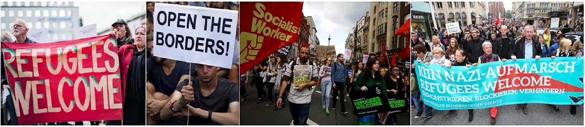 No mês de setembro, inúmeras cidades europeias foram palco de protestos a favor da vinda de refugiados. Milhares de pessoas em, pelo menos, nove países, posicionavam-se a respeito da nobre preocupação em recepcionar vidas que se encontravam em risco, em terras distantes. Protestos foram assinalados em capitais como Berlim, Madri, Estocolmo, Helsinque, Atenas, Lisboa e várias outras cidades na Europa. Na França, o presidente François Hollande, pessoalmente, visitou um centro de abrigo de refugiados sírios perto de Paris, para conferir as condições nas quais se encontravam. Seu governo havia se comprometido em receber 24.000 imigrantes. Em Copenhague, 30.000 pessoas se reuniram em protesto, principalmente após o anúncio de políticas mais restritivas sobre imigração. A Reuters (maior agência de notícias do mundo, com sede em Londres), com perceptível menor ênfase, também informou sobre protestos (como os de Varsóvia) de grupos contrários à vinda de imigrantes em larga escala. Na verdade, em relação ao posicionamento contrário, eram divulgados pontos que subentendiam posturas extremistas (e, portanto, estas opiniões deveriam ser desconsideradas naquele momento). Foi dada relevância a cartazes, por exemplo, onde era citado que “o Islã é a morte da Europa” (sic). Outros grupos foram apontados por algumas fontes como propensos à xenofobia e de orientação totalitária.