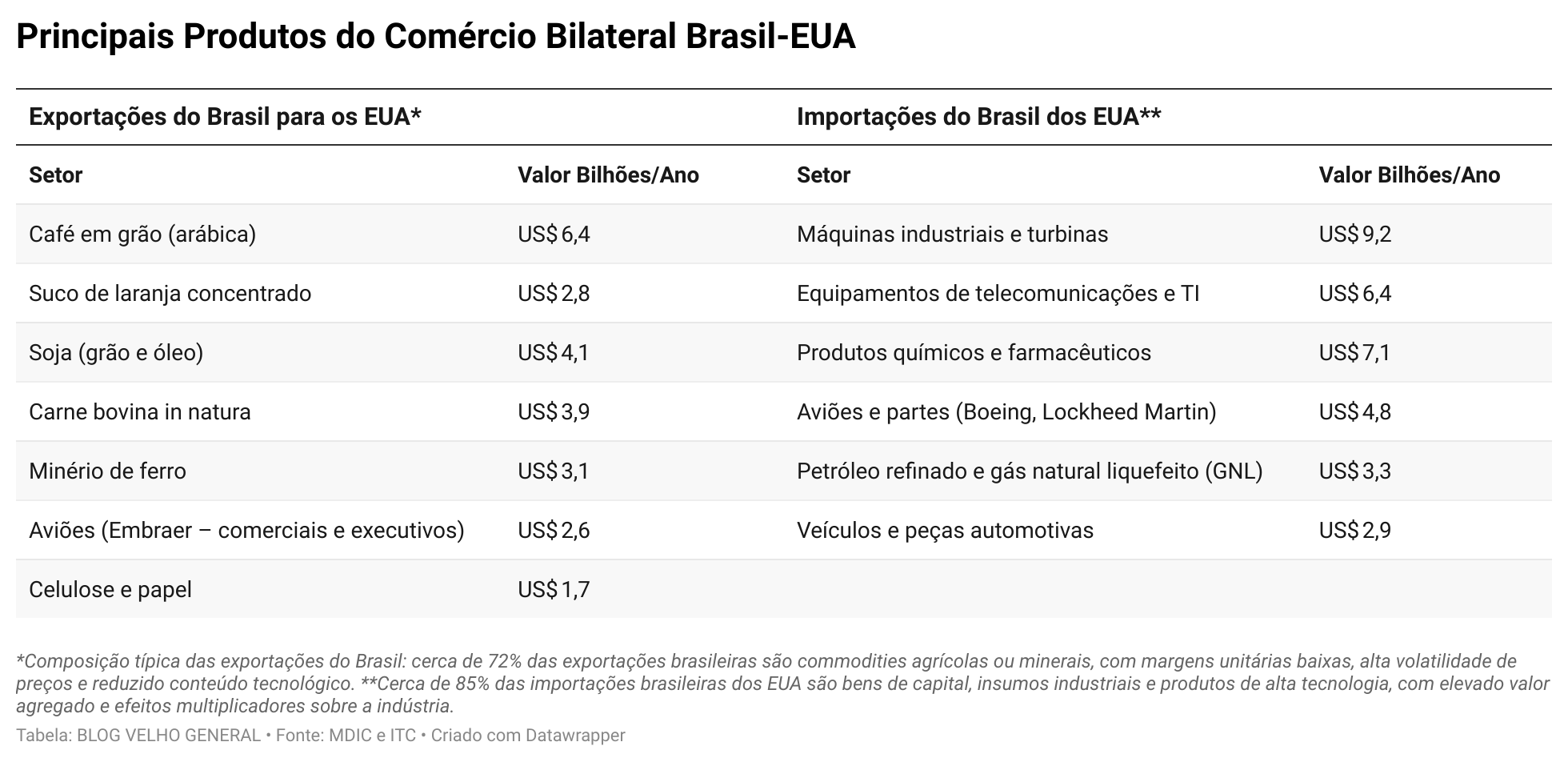 A assimetria na relação comercial se acentua pela natureza dos bens comercializados. Produtos brasileiros, como café, suco e minério, são exportados com margens médias de lucro entre 12% e 20%, enquanto os bens importados dos EUA como turbinas, softwares e componentes farmacêuticos podem atingir margens superiores a 50%.