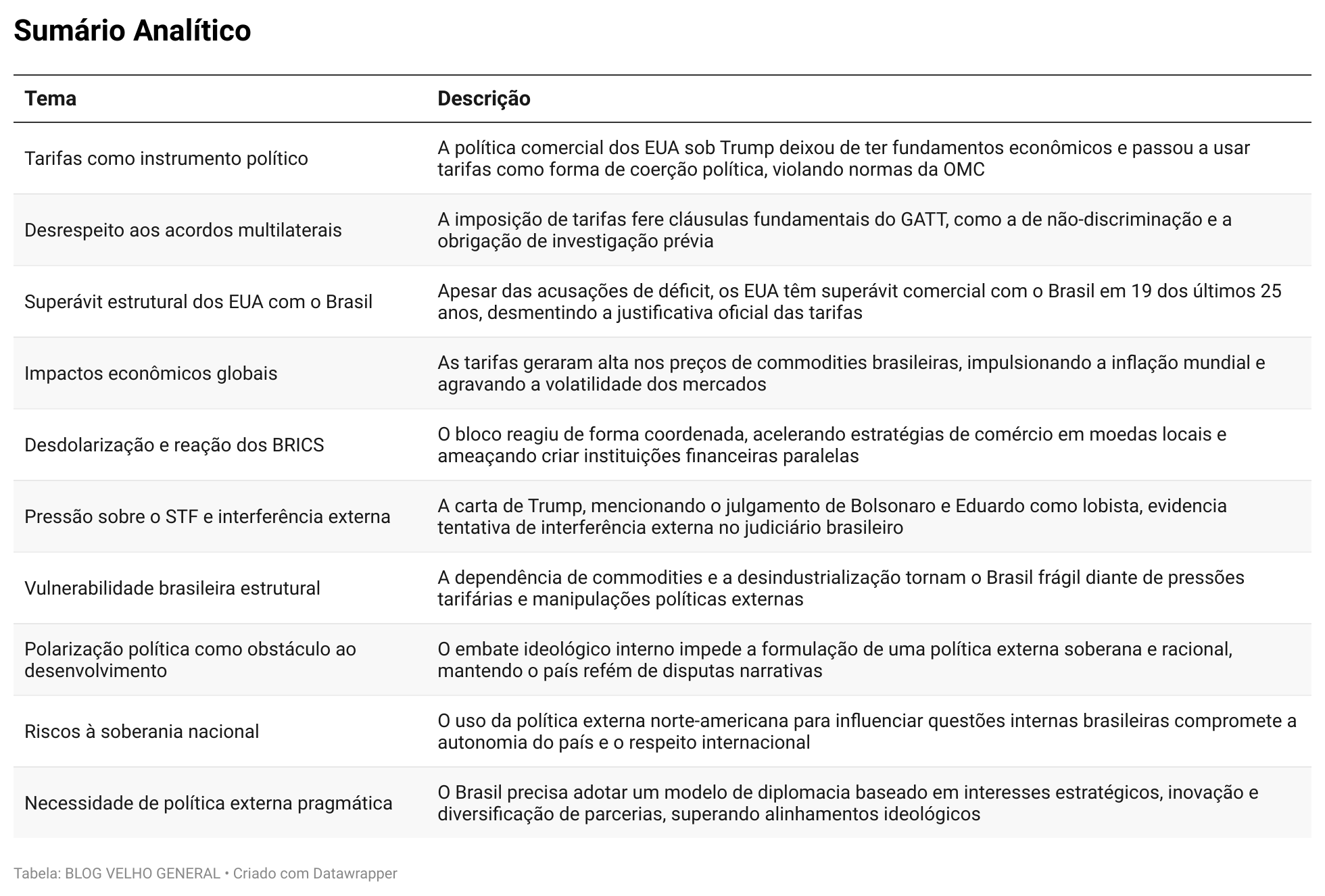 Contudo, os dados comerciais contradizem frontalmente o argumento do déficit comercial. A balança bilateral, como demonstrado, tem sido superavitária para os EUA em 19 dos últimos 25 anos. A medida tarifária, portanto, assume um caráter explicitamente político, rompendo com os princípios do GATT e das normas da OMC, que proíbem a utilização de tarifas como forma de coerção política ou diplomática.