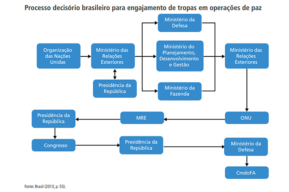 Os órgãos envolvidos vão desde uma Missão Permanente na ONU ao Ministério das Relações Exteriores, Presidência da República, Ministério da Defesa, oficiais de cada uma das Forças e Congresso Nacional, cujo processo decisório é assim organizado: