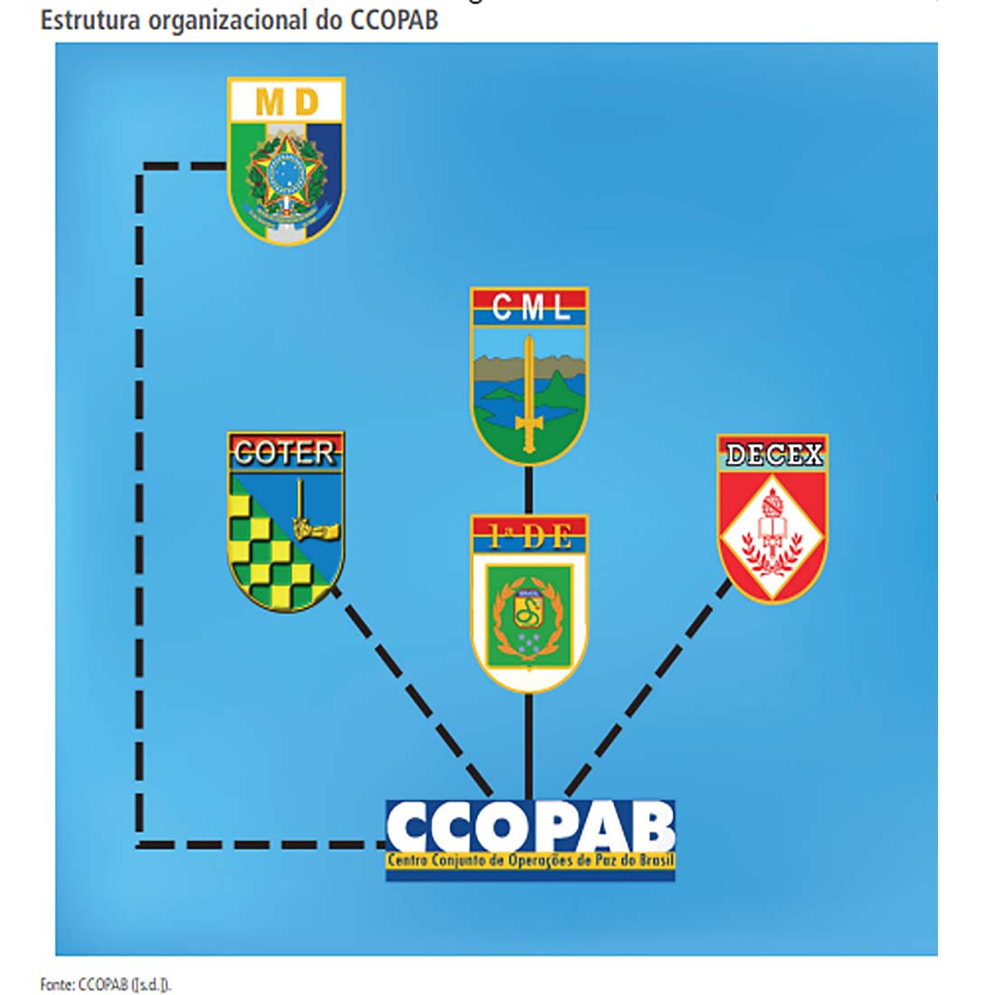“Em um nível mais tático-operacional, outra instituição de suma importância para o Brasil, no tocante às questões de operações de paz, é o Centro Conjunto de Operações de Paz do Brasil (CCOPAB) O CCOPAB tem a missão de preparar militares, policiais e civis para operações de paz e atividades de desminagem humanitária.