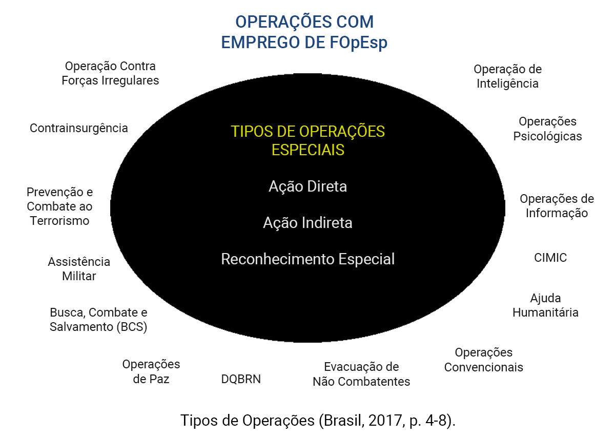 “Força(s) de Operações Especiais (FOpEsp): são forças destinadas à execução das Operações Especiais — frações de Forças Especiais, Comandos e os seus apoios que possuem habilitações e especializações para operar em ambientes hostis, negados ou politicamente sensíveis. As FOpEsp, em termos gerais, podem ser caracterizadas por serem tropas de altíssimo desempenho que realizam missões especiais baseadas em suas capacidades específica (BRASIL, 2019, P. 1-2)”
