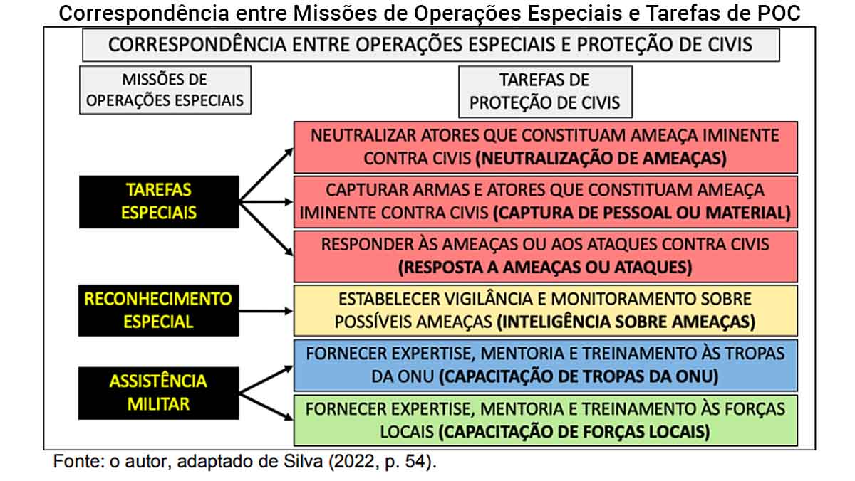 “De acordo com Silva (2023), as Operações Especiais também têm um papel dissuasório significativo no contexto das missões robustas da ONU. Nesse ambiente, elas criam um efeito dissuasório substancial sobre grupos armados hostis, particularmente nas fases de antecipação e resposta, desempenhando um papel relevante dentro da estratégia de protection through projection and deterrence para a proteção de civis. Elas geram um ‘efeito psicológico sobre elementos hostis, que passam a se evadir de locais de homizio para evitar o confrontamento’ (Silva, 2023).”