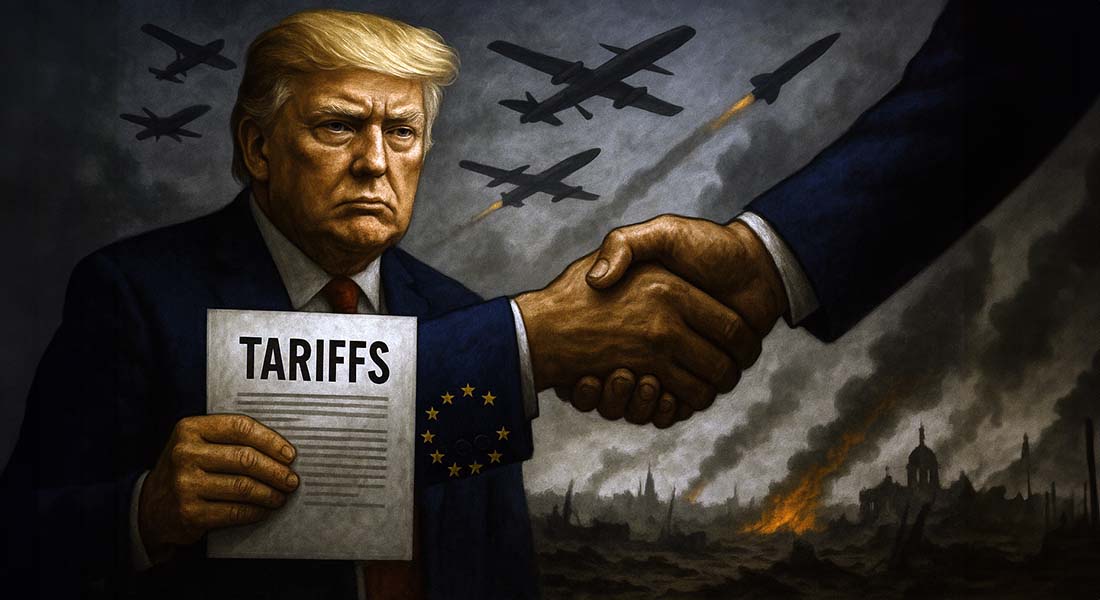 O agora famoso acordo estipula que a Europa pagará: tarifas aduaneiras de 15%, em comparação com a média anterior de 3% (mas para metais industriais, especialmente aço e alumínio, a tarifa permanecerá a mesma de antes, 50%, o que enfureceu os industriais alemães); além disso, a UE se compromete a investir 600 bilhões de dólares nos EUA, a comprar 750 bilhões de dólares em recursos energéticos dos EUA (principalmente gás natural liquefeito) por três anos em aumentos de 250 bilhões de dólares por ano e a comprar centenas de bilhões de dólares em armamento dos EUA (o número exato ainda não foi especificado).