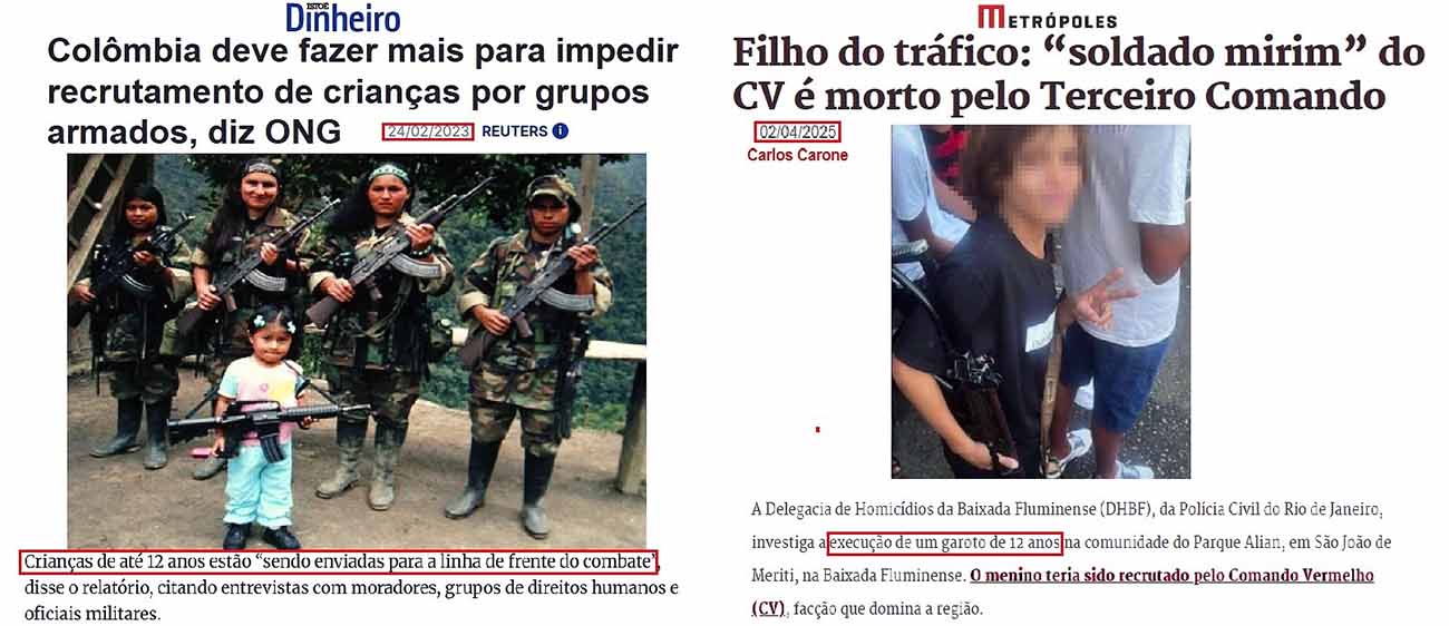 Após o processo de paz na Colômbia, em relação a grupos insurgentes, ocorreu ainda um intenso recrutamento de crianças (os números apresentados foram considerados extremamente subestimados em relação à realidade, tendo a ONU exposto que 600 crianças teriam sido recrutadas por gangues ou grupos insurgentes apenas nos três anos que se seguiram ao acordo de paz). Sem acesso ao básico e incapazes de compreender o discurso que se apresenta, acabam por enxergar uma “oportunidade”. Sim, existe também o “alistamento” forçado (na acepção da palavra). Mas devemos também fazer um paralelo com o que ocorre em vários pontos do território nacional, mesmo nas grandes cidades. Por sinal, tais grupos colombianos possuem parcerias com diversos outros mundo afora, inclusive organizações criminosas brasileiras.