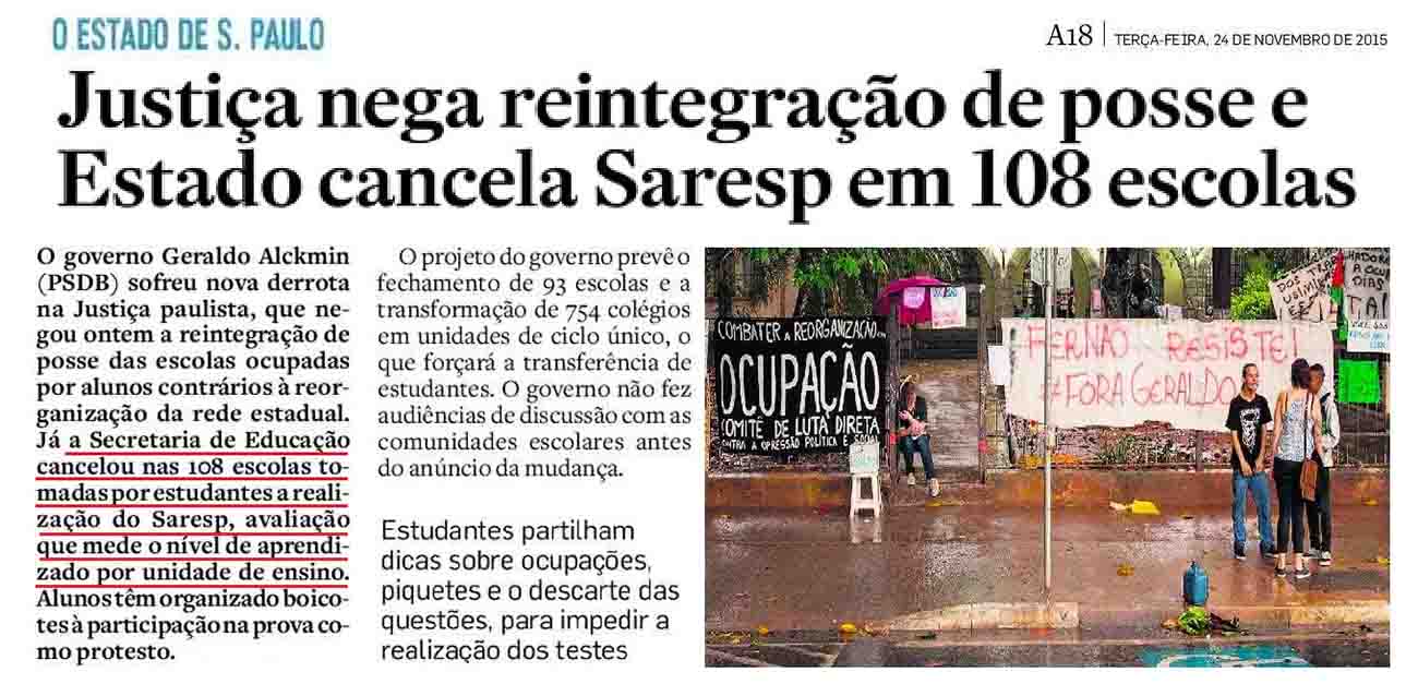 A Justiça chegou a conceder a reintegração de posse tanto da Fernão Dias quanto da Diadema, mas a decisão foi derrubada (…) em 13 de novembro (…). O Governo do Estado recorreu e sofreu uma nova derrota no Tribunal de Justiça de São Paulo. Três desembargadores defenderam, em 23 de novembro, que os estudantes tinham o direito a ocupar as escolas em protesto.”