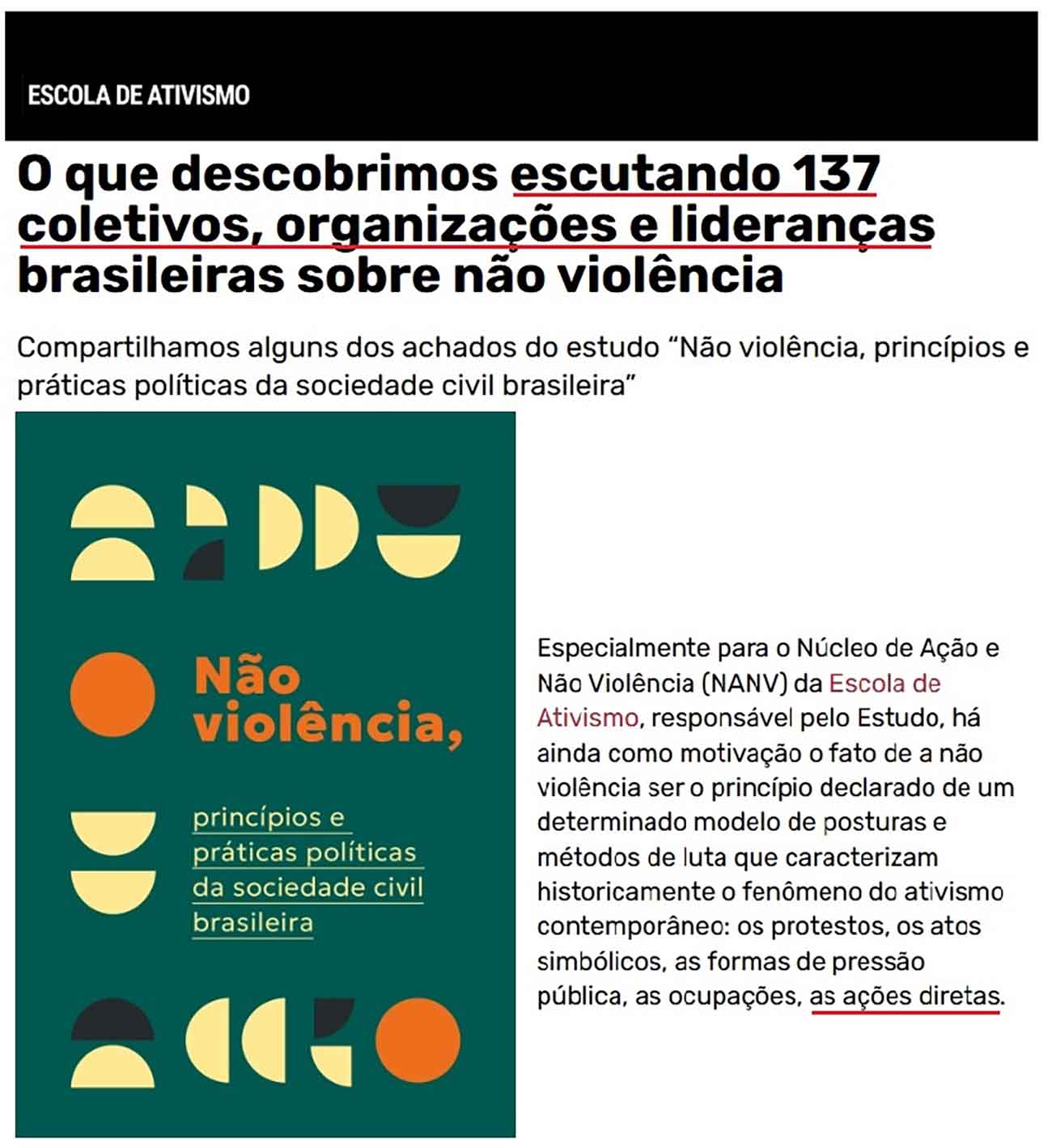No relatório Não Violência, Princípios e Práticas da Sociedade Civil Brasileira (Escola de Ativismo, 2024), ocorreu uma pesquisa que envolveu representantes de 137 coletivos. Destes, verificou-se que: