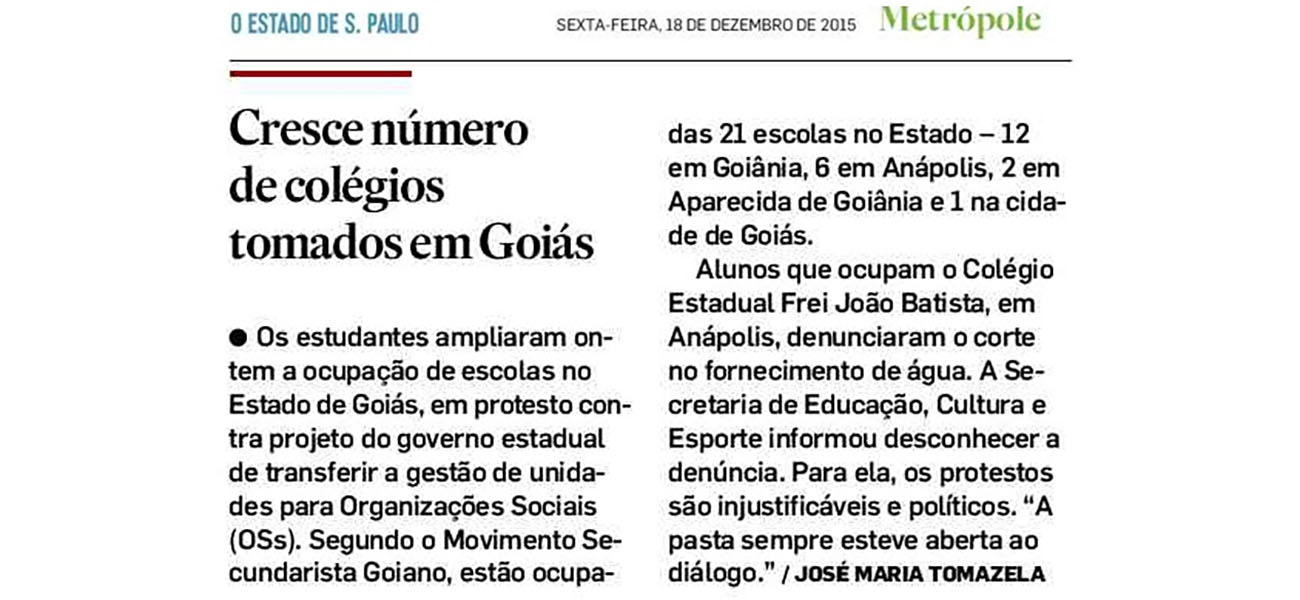 Necessário citar que a ocupação das escolas, no Estado de São Paulo, se deu a partir de novembro de 2015. Havia uma reestruturação escolar anunciada pelo governo estadual, no dia 23 de setembro. Consistia em separar as escolas para que passassem a ofertar somente um dos ciclos da educação (ensino Fundamental I, Fundamental II ou o Médio) a partir do ano seguinte. O que causou os protestos foi a notícia do fechamento de 93 estabelecimentos de ensino e a transferência de alunos. Tal reconfiguração envolveria 1.464 escolas, a transferência de 311 mil alunos e afetaria a rotina, também, de 74 mil professores. No dia 28 de outubro, o governo estadual tornou pública a lista das 93 escolas que seriam disponibilizadas para outras finalidades na área de educação e, em 1º de dezembro, publicou um decreto com a transferência de funcionários.