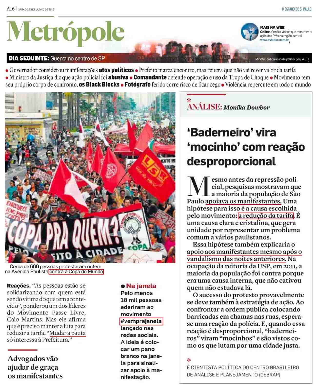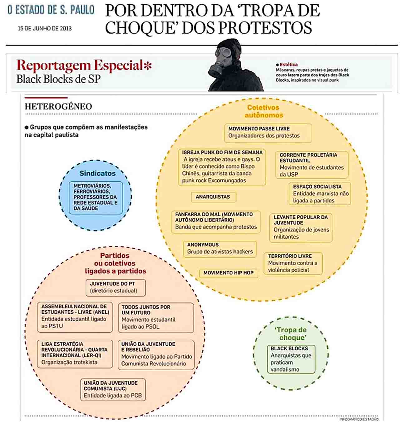 Havia, porém, uma lição que talvez não tivesse sido adequadamente considerada (pelo menos por alguns atores) quando começaram a ocupar as escolas. Não estamos nos referindo, neste momento, ao protesto que envolveu 600 mil estudantes do ensino médio, 300 mil universitários, professores e apoiadores (o que incluiu mais de uma centena de sindicatos e organizações) no Chile, em junho de 2006 (onde a pauta era reforma educacional, transporte gratuito e isenção de taxas para o vestibular aos secundaristas, bem como a própria legislação alusiva à educação). Cerca de dois anos antes do que ocorria nas escolas (em São Paulo e outros Estados brasileiros), um protesto contra o aumento da tarifa de ônibus tomou corpo, espalhou-se por todo país (havendo um expressivo leque de reivindicações que se somaram, bem como a exposição de insatisfações) e acabou por “fazer surgir” um novo componente nos noticiários brasileiros: os Black Blocs. Não que estes fossem desconhecidos no exterior, mas passaram a compor rotineiramente as reportagens nacionais naquele período.