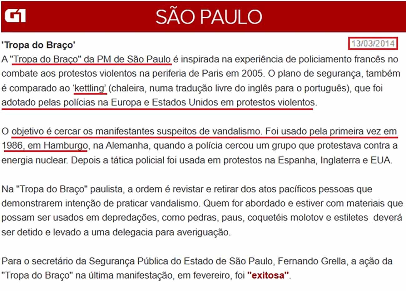 Entre outras medidas que foram testadas (e implementadas), vale citar a utilização da tática Kettling (também conhecida como Caldeirão de Hamburgo). Tendo como um dos idealizadores o policial britânico (e, posteriormente, acadêmico/pesquisador, vindo a se tornar professor de Política Social na Universidade de Wolverhampton) Peter Anthony James Waddington (conhecido como PAJ Waddington) consistia, de forma singela, na contenção de grupos que protestavam e na detecção de indivíduos que estariam, no meio daquela massa, portando itens como artefatos incendiários e explosivos improvisados, materiais a serem utilizados em depredações, etc. Estes seriam retirados e levados para identificação, apreensão dos objetos e eventual responsabilização na esfera judicial. Em São Paulo, o contingente policial que empregou o método ficou conhecido como “Tropa do Braço”.
