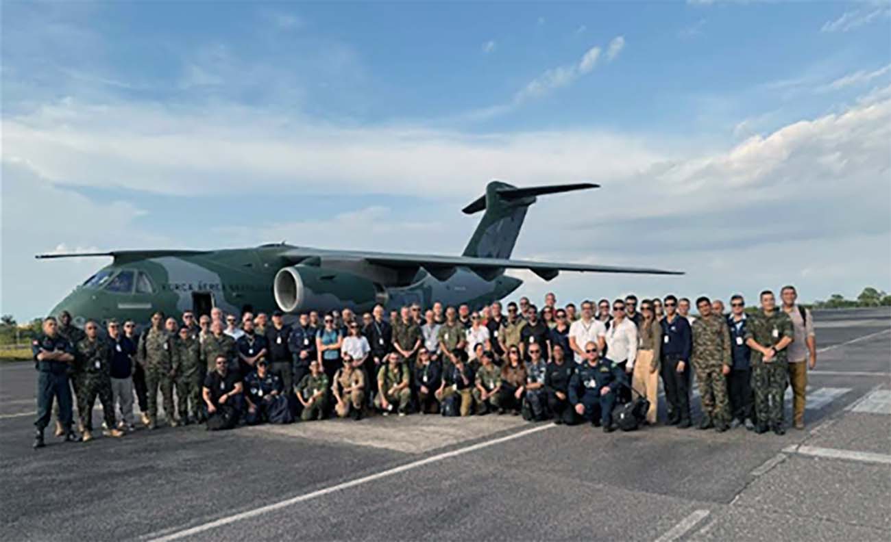 FIGURA 1: Foto tomada após o pouso do KC-390 na Base Aérea de Manaus (BAMN) partindo do Galeão-RJ. Estagiários do CAEPE 2025 e mestrandos do PPGSID 2025 (Acervo do autor).
