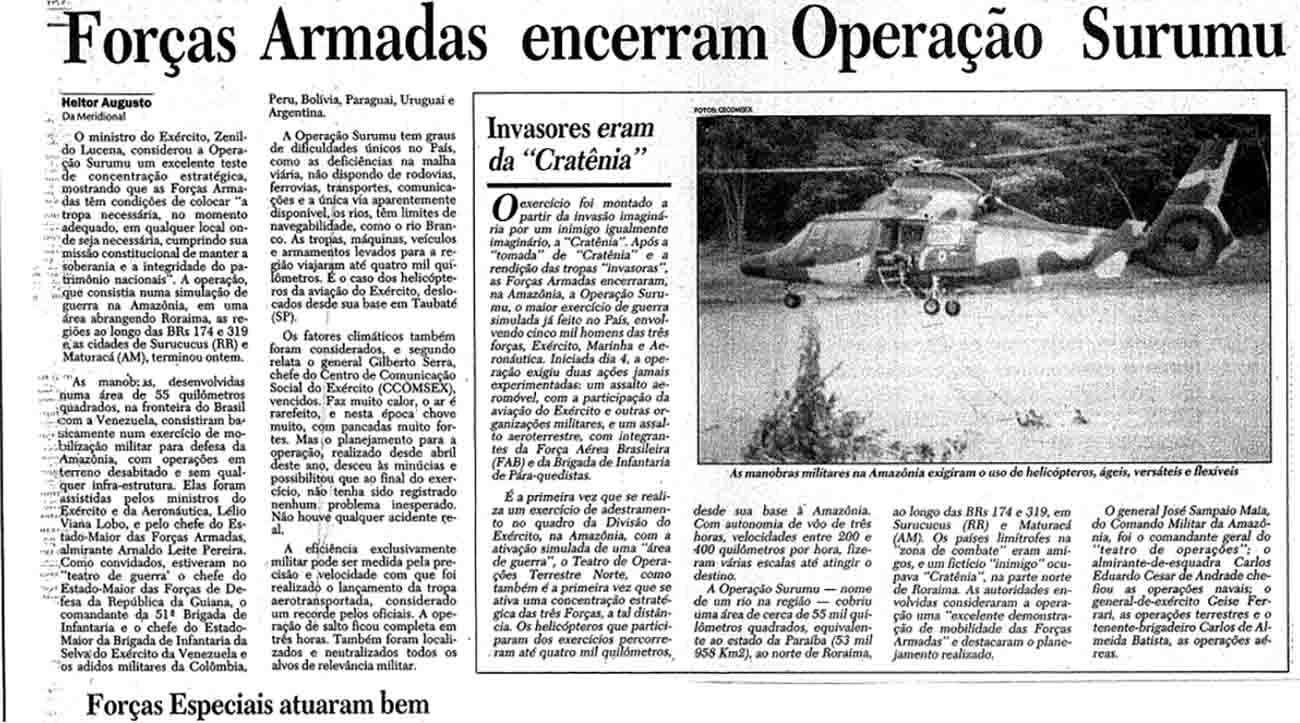 Woloszyn, em Inteligência Militar, destaca que (p. 171) um episódio exitoso realizado pela inteligência militar brasileira ocorreu ainda 1993 quando o Comando do Exército foi alertado que o comando Sul dos EUA planejava realizar, sem aviso prévio, manobras militares na Guiana, a 300 km da fronteira com o Brasil, fato que acabou desencadeando a Operação Surumu, o maior exercício de mobilização militar para a defesa da Amazônia, cujo inimigo fictício ocupava “Cratênia”, no norte de Roraima.