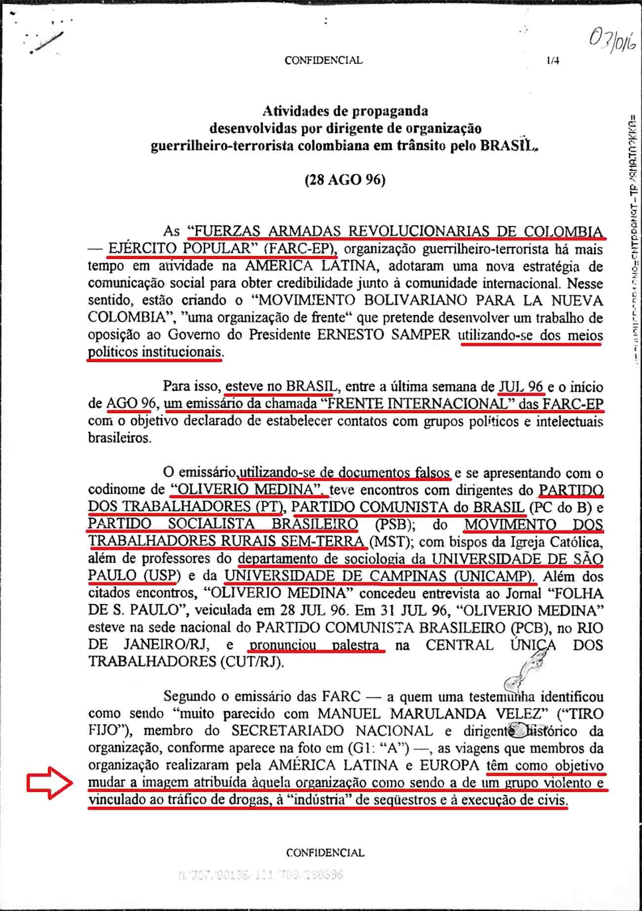 Por exemplo, dos documentos que podem ser acessados por qualquer cidadão no Arquivo Nacional, já era perceptível na década de 1990 uma presença considerável de atores não-estatais armados na região amazônica. Tanto que as FARC-EP haviam atacado um posto do Exército Brasileiro às margens do Rio Traíra no início de 1991 (sugerimos a leitura do artigo O Alto Preço da Soberania: Fronteira e Insurgência). Poucos anos depois dessa afronta à soberania nacional, era registrado que um representante dessa organização terrorista veio ao Brasil, efetuou uma palestra, encontrou-se e conversou com professores de renomadas universidades, partidos políticos e movimentos sociais, buscando “mudar a imagem” que tinham de sua organização.