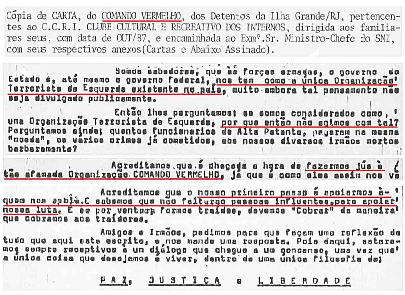 Há três décadas existem alertas documentados (que podem ser acessados por qualquer cidadão) a respeito do interesse de organizações criminosas em possuírem representação política. Se lermos no noticiário atual a respeito de parlamentares sendo presos por sabidamente possuírem vínculos com o crime organizado, representantes de associações ou grupos (representantes estes, também, com fortes vínculos com organizações criminosas) que acabam sendo recebidos nas mais altas esferas do poder, tal fato já era alertado muito tempo atrás. Basta uma breve pesquisa no Arquivo Nacional.