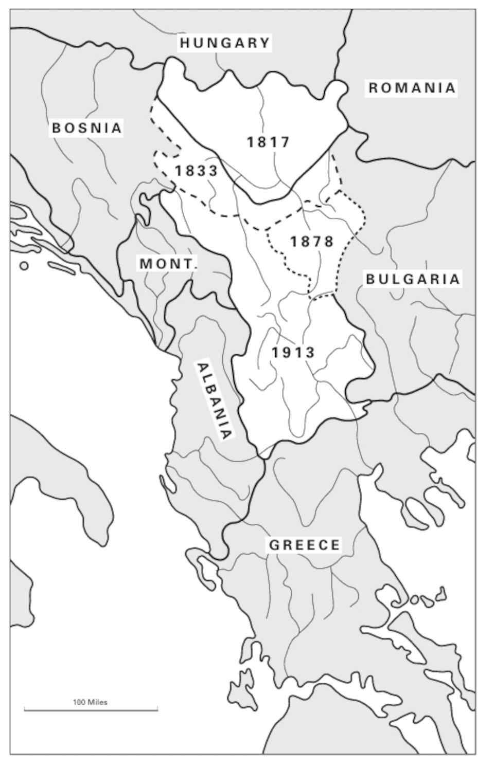 A Figura 1 mostra o crescimento da Sérvia entre 1817 e 1913, evidenciando como o Estado sérvio se expandiu às custas do recuo otomano.