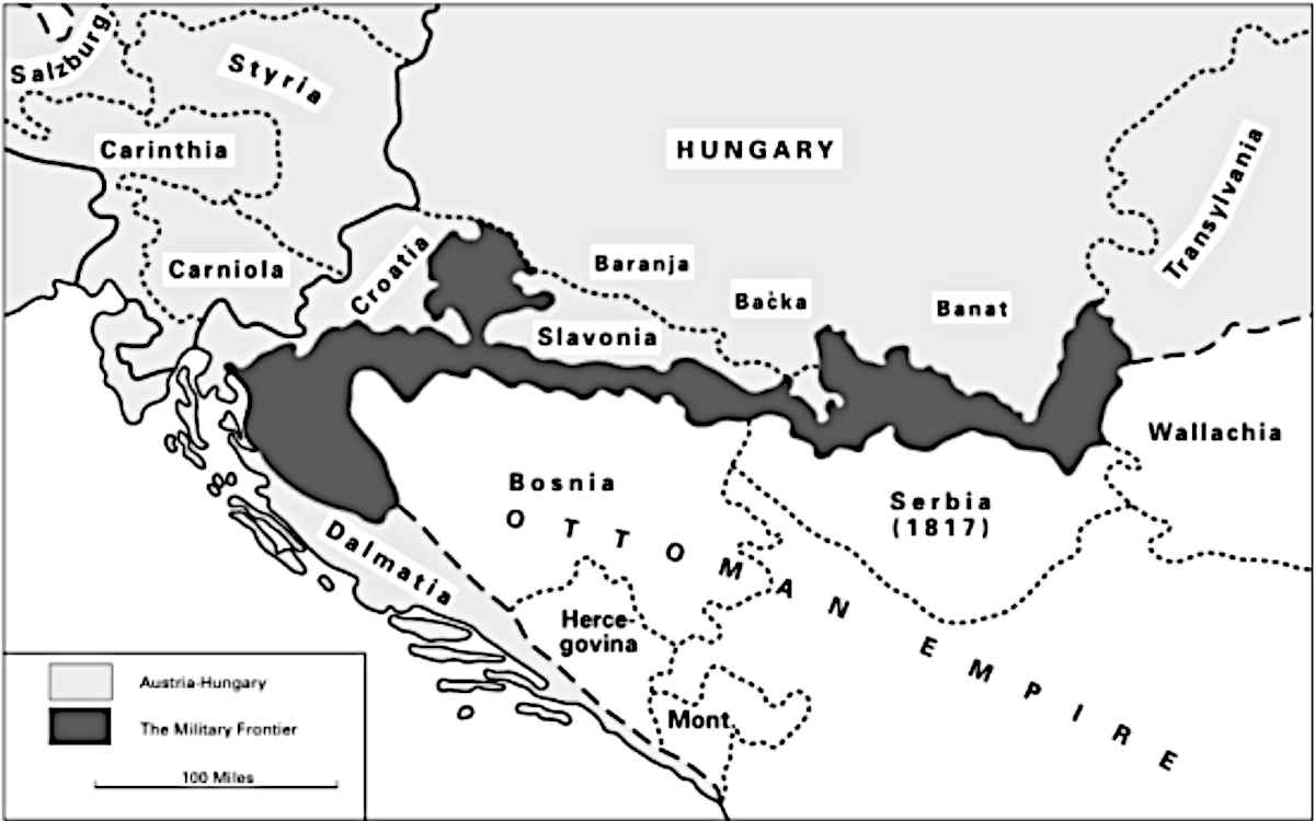 Já a Figura 2 apresenta a fronteira militar entre a Áustria-Hungria e o Império Otomano, destacando os Bálcãs como linha divisória tripla: germânica, eslava e otomana.