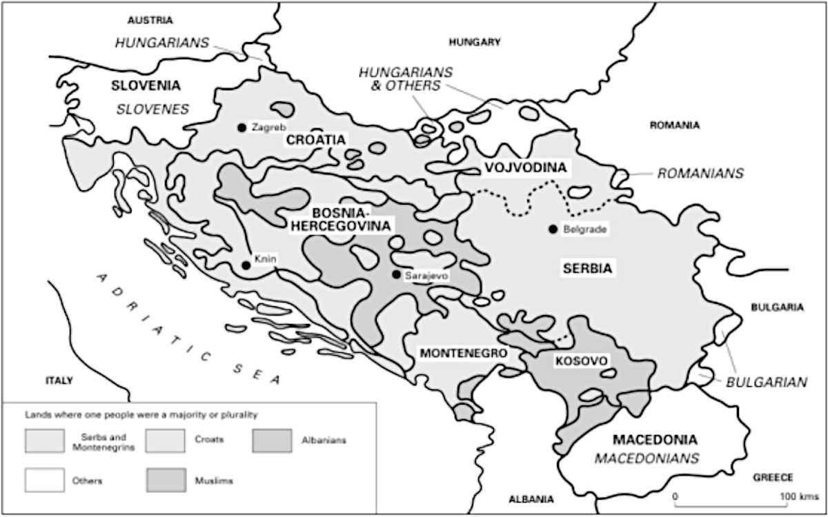 A Figura 6 mostra a distribuição dos povos na Iugoslávia em 1991, evidenciando a complexidade étnica da federação e os potenciais focos de conflito.