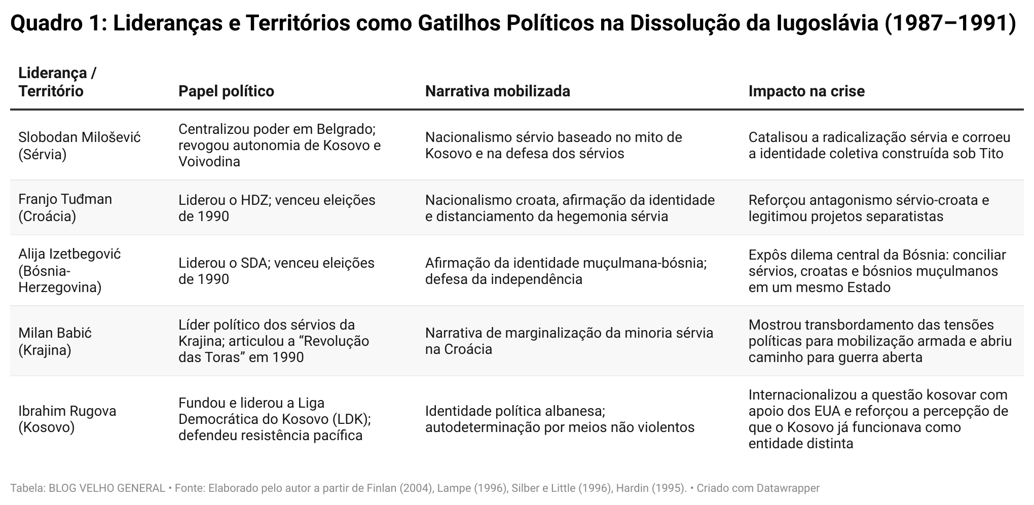 Para consolidar a leitura política de 1987 a 1991, os três quadros seguintes funcionam como uma lente integrada. O Quadro 1 organiza as lideranças e territórios críticos, mostrando quem acionou os gatilhos e com quais narrativas de poder. O Quadro 2 apresenta a cronologia dos eventos internos e da resposta internacional, evidenciando a sequência que transformou tensão política em ruptura federativa. O Quadro 3 sintetiza as matrizes discursivas nacionalistas, conectando símbolos e memórias ao cálculo político das elites.