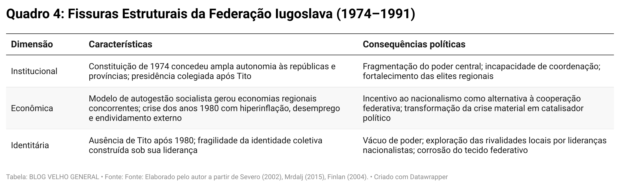 O Quadro 4 sintetiza as principais fissuras estruturais que corroeram a coesão da federação iugoslava entre 1974 e 1991. Ele organiza em três dimensões – institucional, econômica e identitária – os fatores que, combinados, fragilizaram o Estado e abriram espaço para a radicalização política descrita nos itens anteriores. A descentralização constitucional, a crise econômica e o vácuo de liderança após Tito não atuaram isoladamente, mas de forma interdependente, transformando o sistema federativo em uma arena de disputas regionais. Assim, o quadro evidencia como as falhas de estrutura funcionaram como condições de possibilidade para que narrativas nacionalistas se tornassem projetos políticos de ruptura.