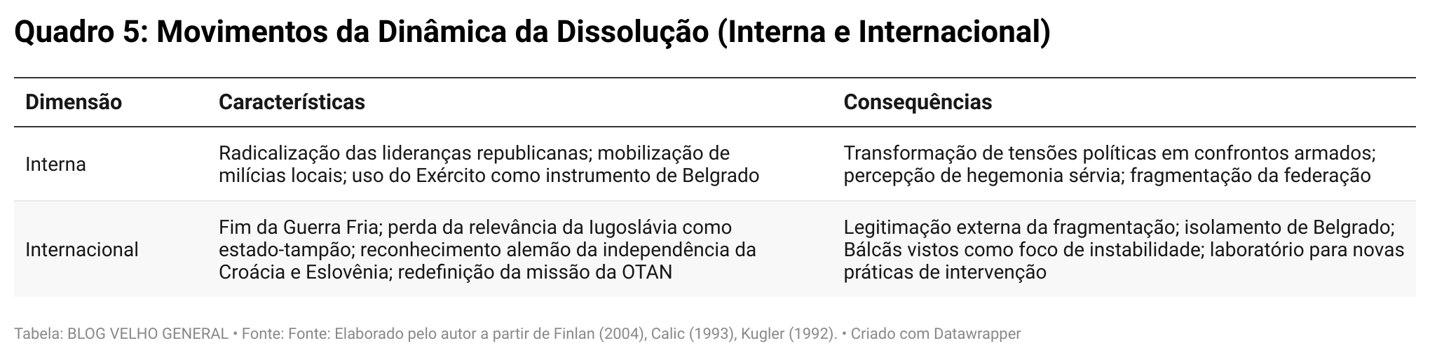 O Quadro 5 sintetiza os principais movimentos que compuseram a dinâmica da dissolução da Iugoslávia, articulando fatores internos e internacionais. No plano interno, a radicalização das lideranças e a militarização das disputas corroeram a possibilidade de cooperação federativa. No plano internacional, o fim da Guerra Fria retirou da Iugoslávia sua função estratégica, enquanto o reconhecimento alemão e a redefinição da OTAN aceleraram a fragmentação. Juntos, esses movimentos mostram que a dissolução não foi apenas resultado de pressões domésticas, mas também da transformação do sistema internacional, que reduziu os constrangimentos externos e abriu espaço para que as dinâmicas locais se intensificassem.