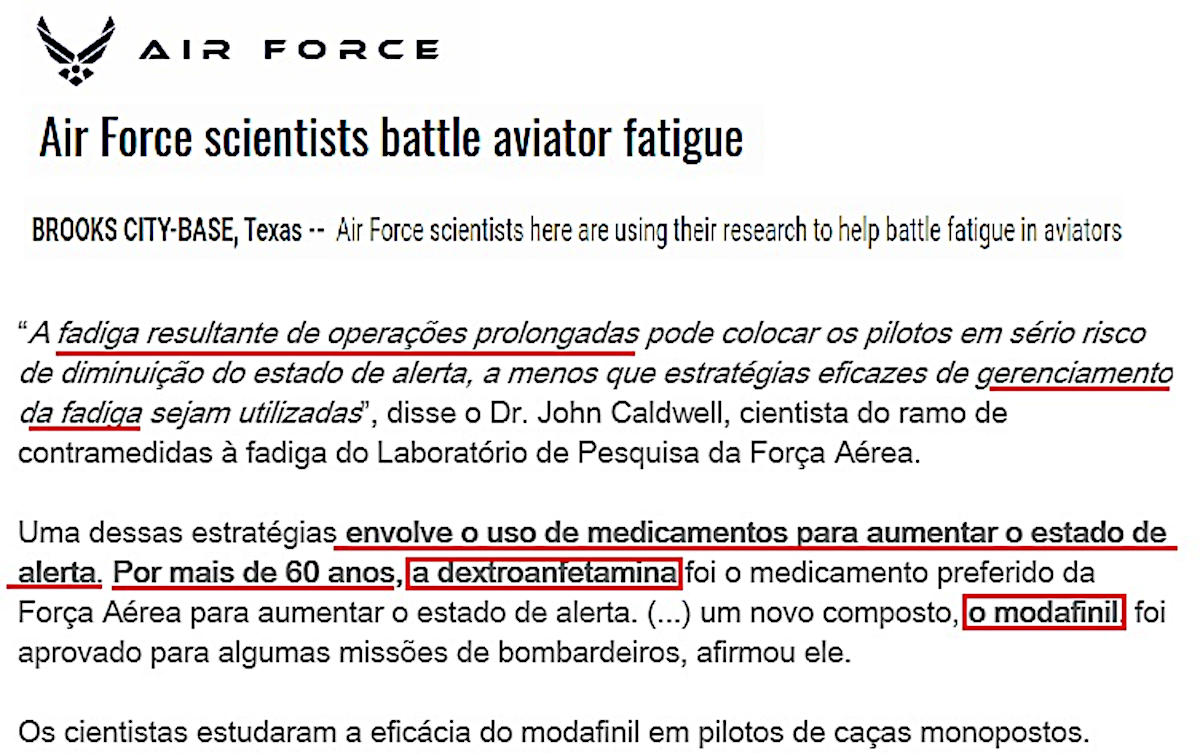 Figura 4: Em publicação em sua página oficial, nos idos de 2009, a Força Aérea dos EUA citava o gerenciamento de fadiga e o uso de medicamentos para tal. A Dextroanfetamina, utilizada por mais de seis décadas, deu lugar ao Modafinil (af.mil).