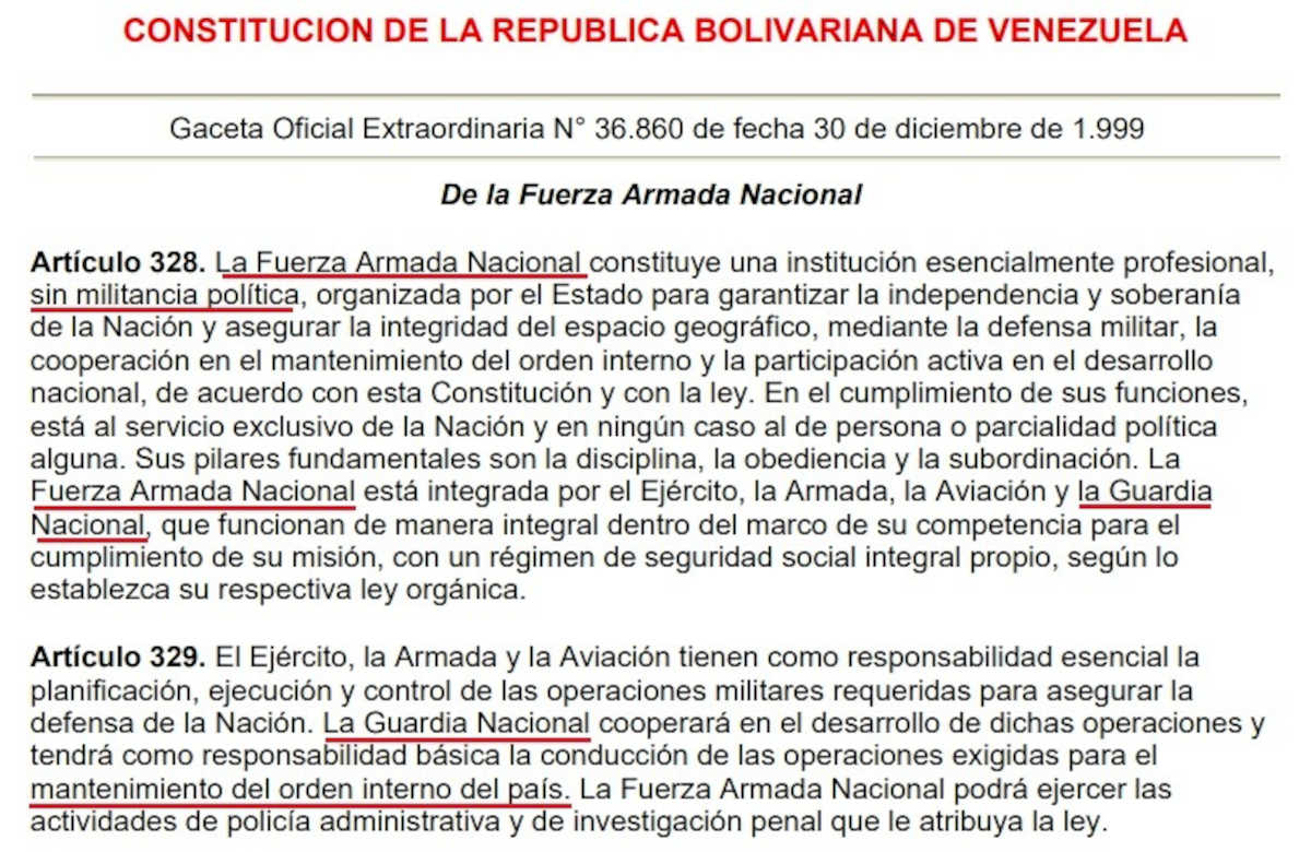 É adequado esclarecer que a GNB é um dos componentes da Força Armada Nacional – conforme se lê na Constituição da Venezuela –, que não deve ser confundida com a Polícia Nacional, também elencada no texto constitucional.