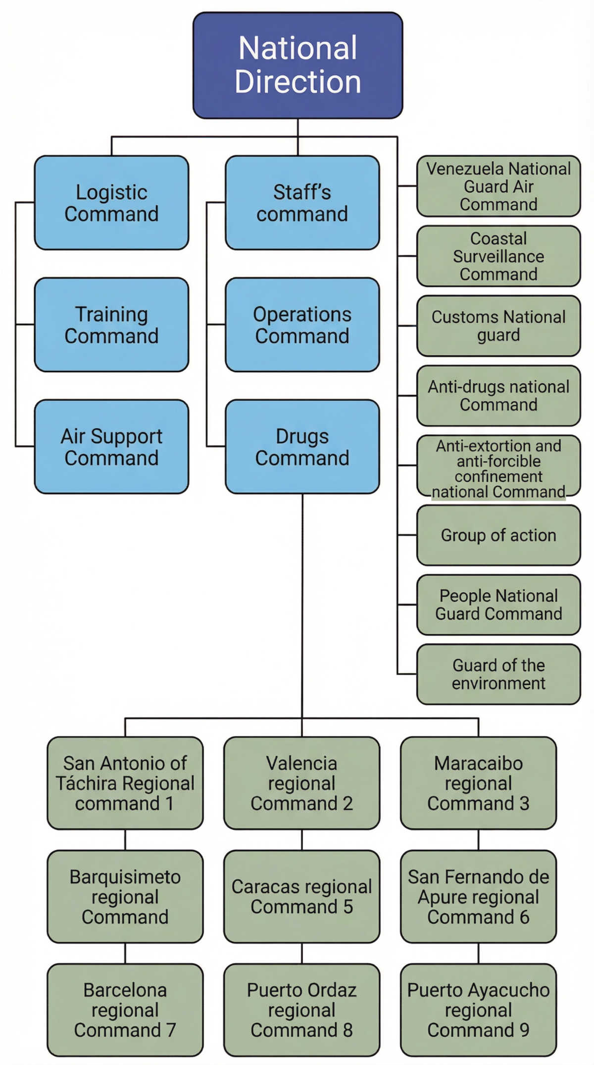 Tendo como incumbência missões necessárias à manutenção da ordem interna, vigilância de fronteiras, portos e aeroportos, possui grande vínculo com o dirigente máximo do poder executivo. De qualquer forma, conforme a legislação pertinente às Forças Armadas (Bolivarianas), a GNB acaba por ter uma espécie de dupla “subordinação”: do ponto de vista administrativo, responde ao ministro da Defesa; do lado operacional, ao comandante operacional estratégico (sobre o qual recai a responsabilidade pelo planejamento e direção de todas as operações militares). Este, por sua vez, se reporta diretamente ao presidente.