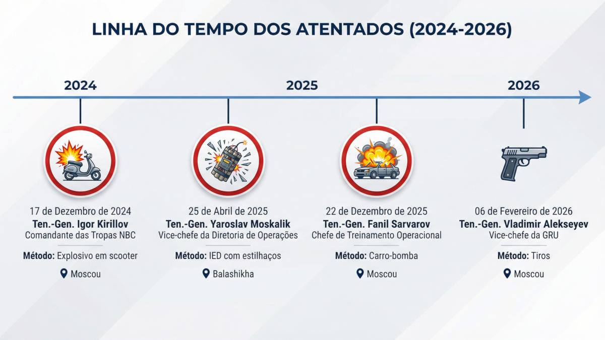 Entre dezembro de 2024 e fevereiro de 2026, uma série de atentados contra altos oficiais das Forças Armadas da Rússia ocorreu em Moscou e regiões próximas, atraindo atenção internacional. Os episódios se deram em meio à continuidade da guerra na Ucrânia e às tentativas de negociação mediadas pelos Estados Unidos. Moscou atribuiu todos os ataques a Kiev, enquanto autoridades ucranianas mantiveram silêncio ou fizeram declarações indiretas.
