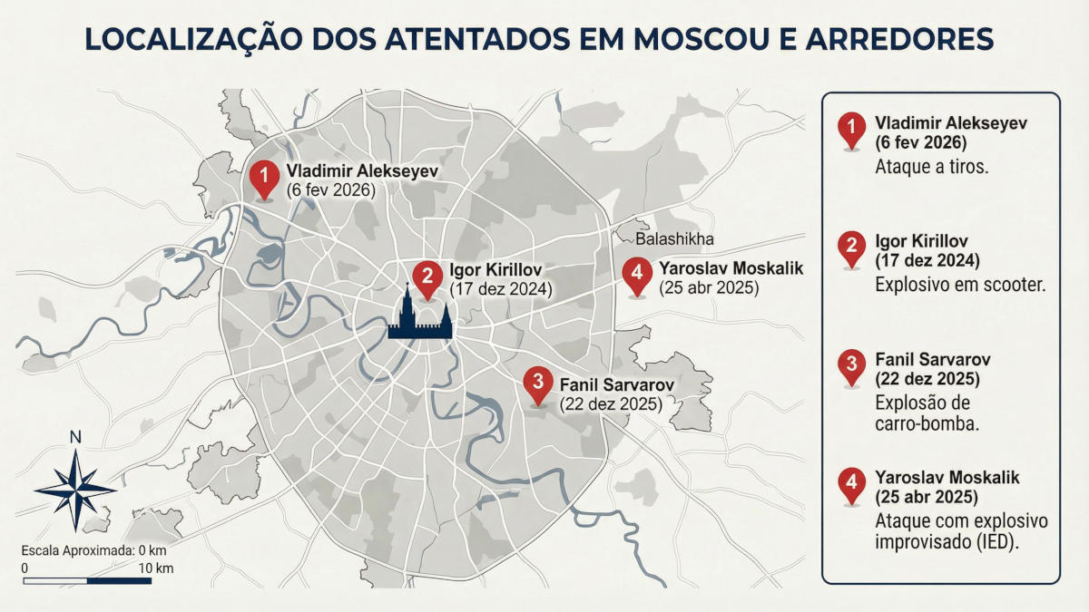Os atentados contra altos oficiais russos entre 2024 e 2026 mostram uma sequência de operações direcionadas a figuras centrais das estruturas militar e de inteligência do país. Embora Moscou atribua todos os episódios à Ucrânia, e Kiev raramente comente oficialmente, analistas internacionais destacam que os ataques apresentam características de operações de inteligência altamente especializadas. A repetição de incidentes em áreas urbanas monitoradas sugere vulnerabilidades na contrainteligência preventiva russa e na proteção de autoridades.