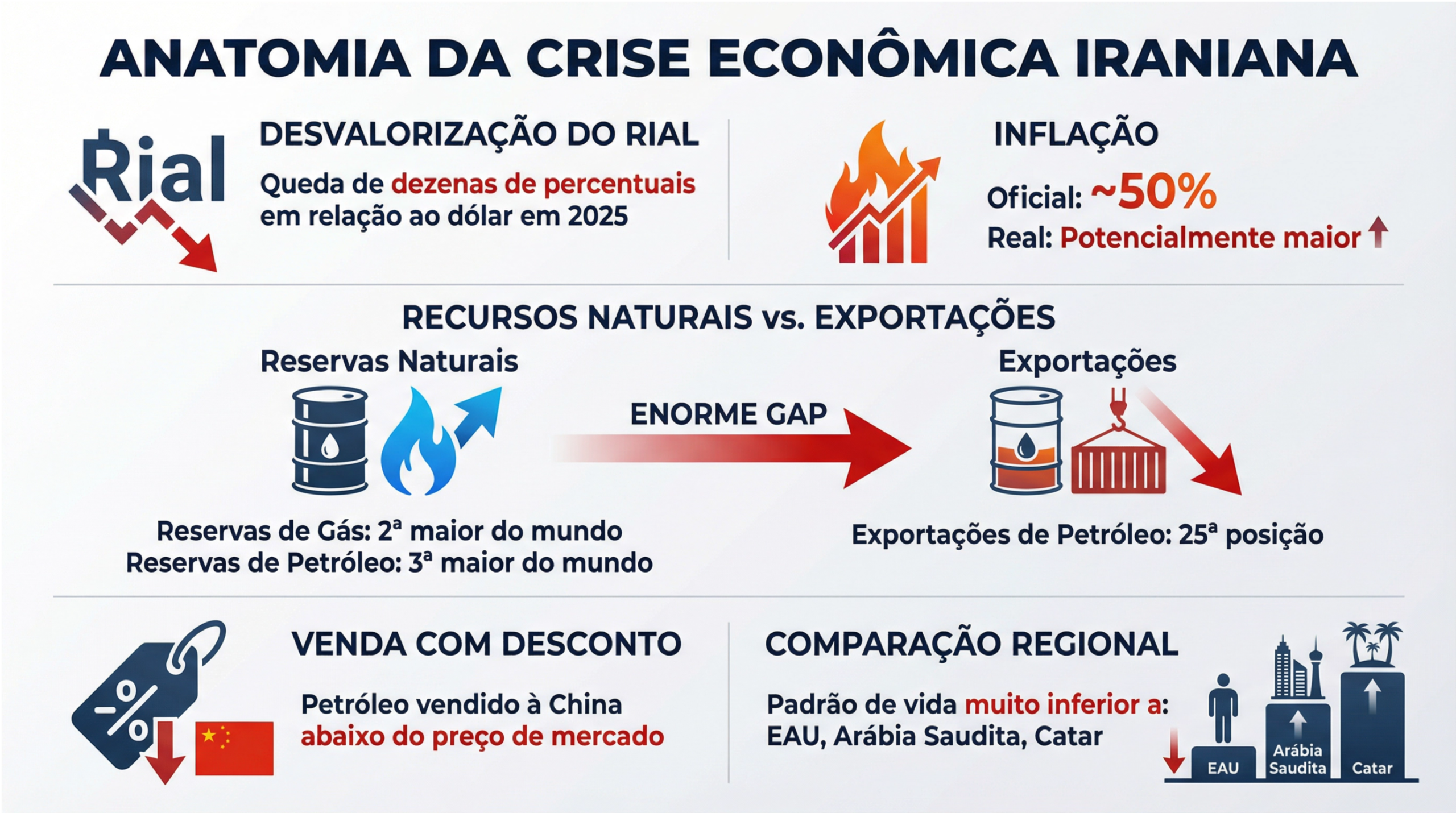 A economia afetou a base social tradicional do governo iraniano – pequenos negócios e comerciantes. Foram eles que saíram para as ruas, aos quais se juntaram mais tarde os estudantes. Se nos lembrarmos, os protestos anteriores em 2024 também foram causados por dificuldades econômicas – pensões baixas e salários desproporcionais em relação à inflação. Por cima de tudo, os Estados Unidos intensificam regularmente as sanções.
