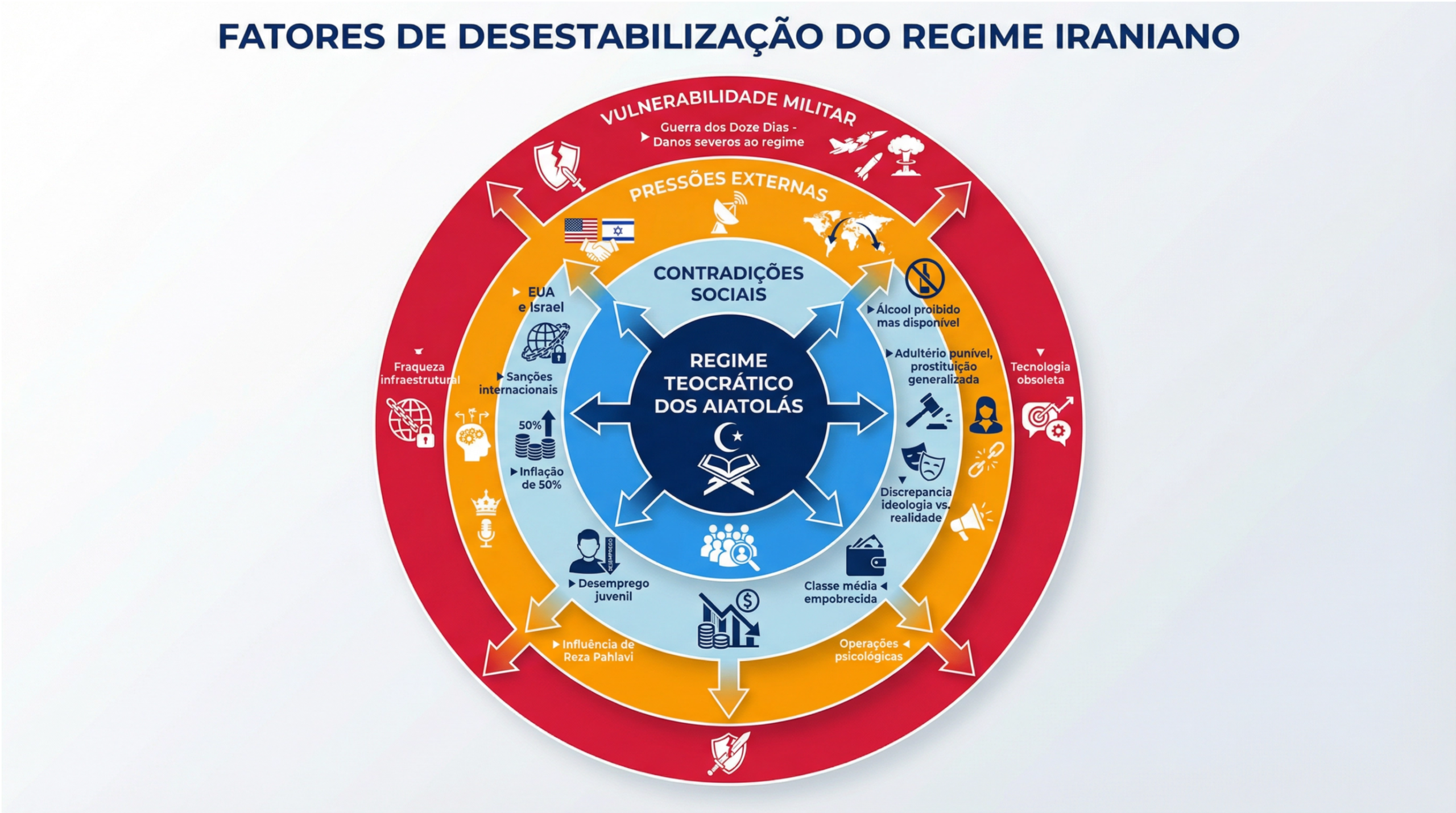 Outro fator explorado na condução de uma guerra híbrida contra o Irã é também o fato de ser um país multinacional. E não há uma ideia universal, uma imagem do amanhã, que agrade aos persas, aos caucasianos, aos árabes e aos azeris. A que existe atualmente, baseada nos fundamentos teocráticos já descritos – como se vê – já não funciona como fator de coesão e integração nacional.