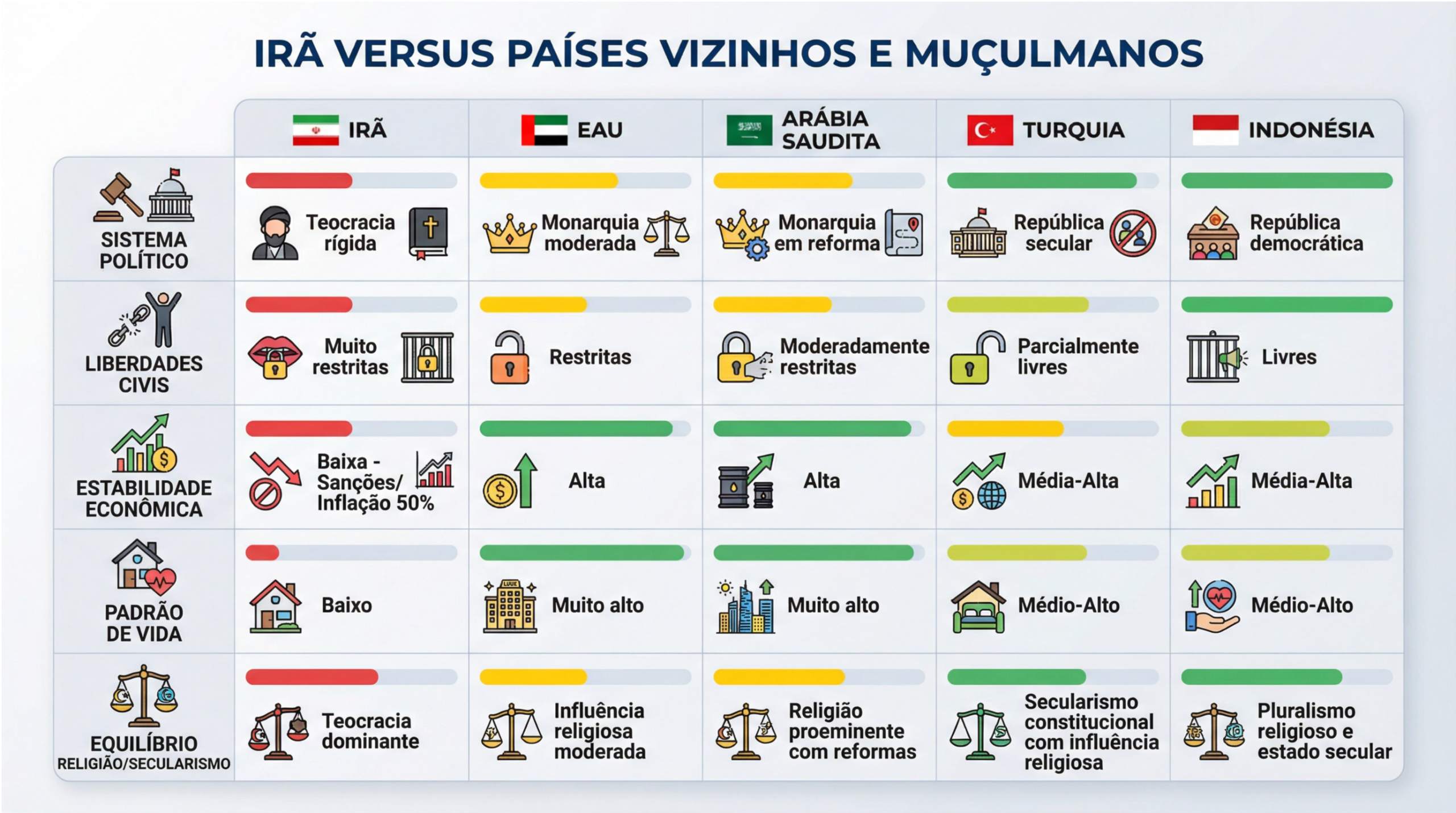Mesmo no Iraque, que os diplomatas britânicos inventaram e traçaram com uma régua, tendo emergido de guerras fratricidas, conflitos étnicos, rebeliões armadas, a situação atual é muito diferente da iraniana, com maior estabilidade social e econômica. Além disso, países muçulmanos com forte equilíbrio entre religião e secularismo, como a Turquia e Indonésia, acabam por criar uma percepção para o iraniano médio no sentido de que o estilo de vida secular dá às pessoas mais liberdade interna e externa, permitindo a formação de uma juventude altamente crítica e permeável a influências projetadas externamente.