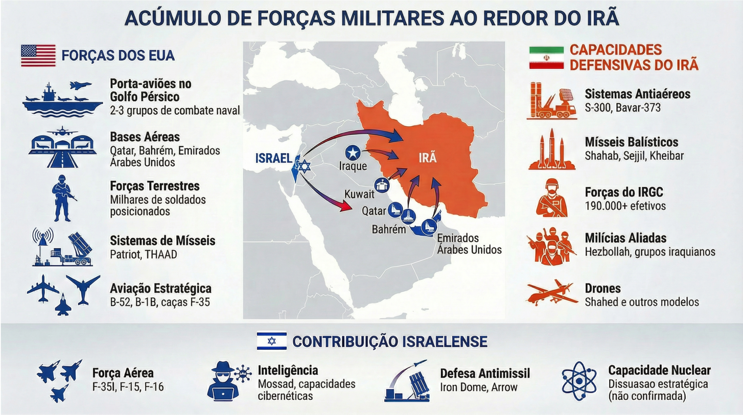 Portanto, acreditamos que os EUA provavelmente se limitarão a ataques pontuais a instalações nucleares, armazéns militares e instituições governamentais. Uma invasão em grande escala é pouco provável.