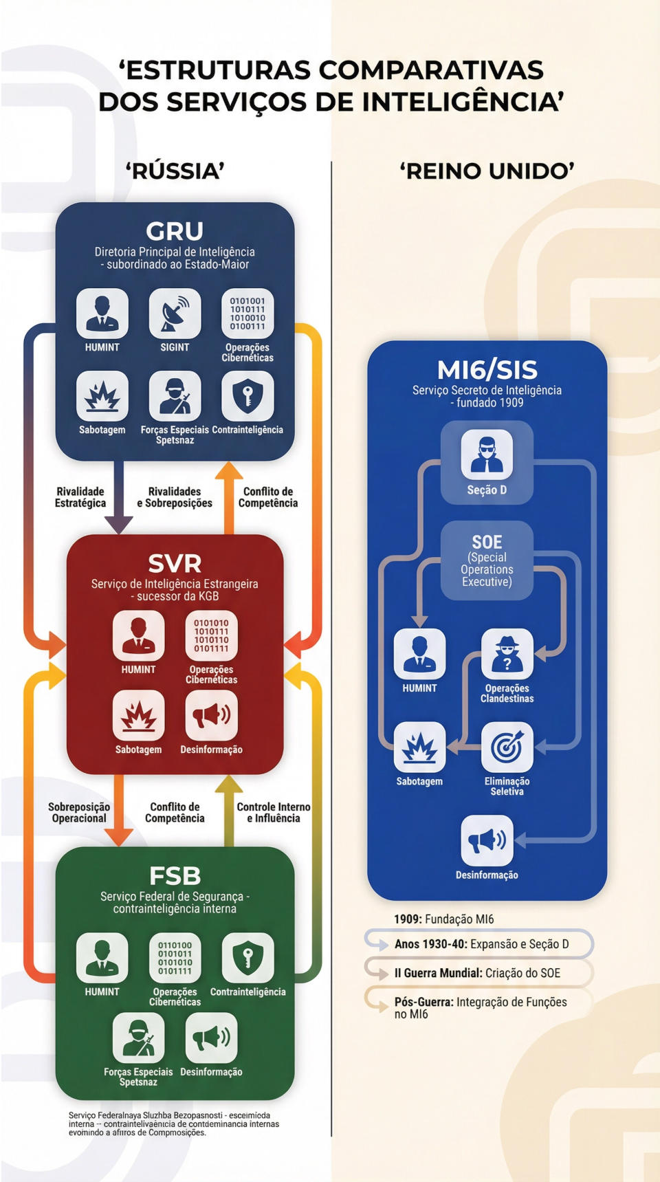 Este breve artigo apresenta um resumo histórico e operacional dos principais serviços de inteligência da Federação Russa (GRU, SVR e FSB) e do Reino Unido (MI6), com foco em suas origens, evolução e modus operandi em operações de sabotagem e ações clandestinas no exterior, com objetivo de entender onde o governo russo tem errado em matéria de comunicação estratégica e nos protocolos de contrainteligência e contrasabotagem.