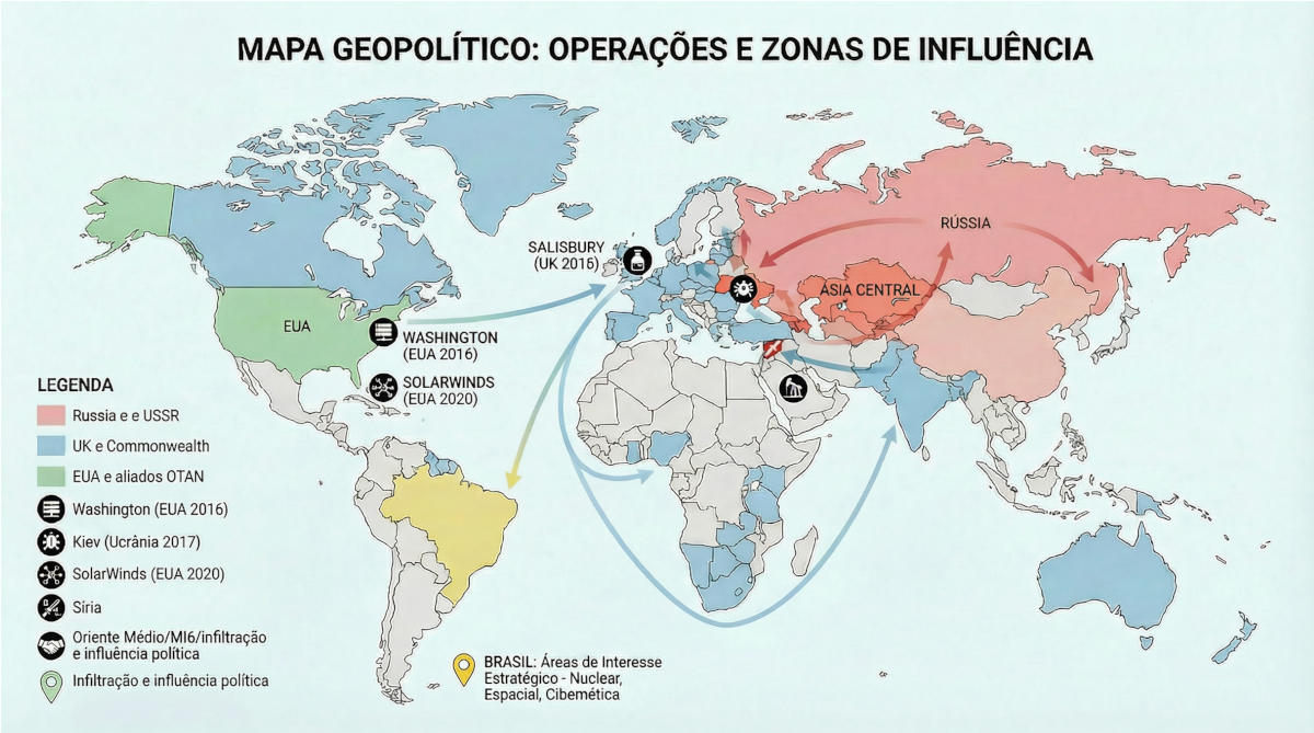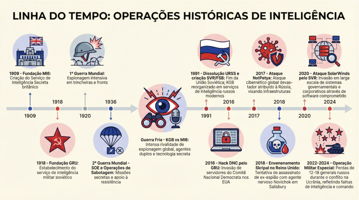 Inteligência estratégica além das fronteiras: como GRU, SVR, FSB e MI6 operam em operações de sabotagem, contrainteligência e guerra moderna, revelando vulnerabilidades que definem os conflitos contemporâneos.