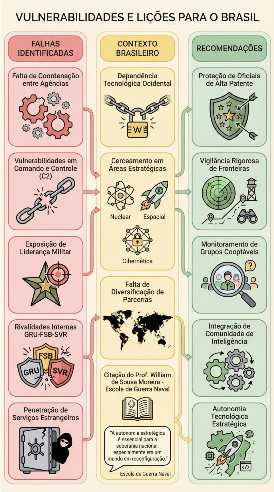 Uma das lições é que a proteção de oficiais de alta patente e especialistas, a vigilância rigorosa das fronteiras e o monitoramento de grupos internos potencialmente cooptáveis, são imperativos estratégicos. Em síntese: a guerra moderna não se limita ao campo de batalha físico; ela se estende ao domínio da informação e da subversão, onde a capacidade de proteger ativos humanos e tecnológicos é tão vital quanto a superioridade militar.