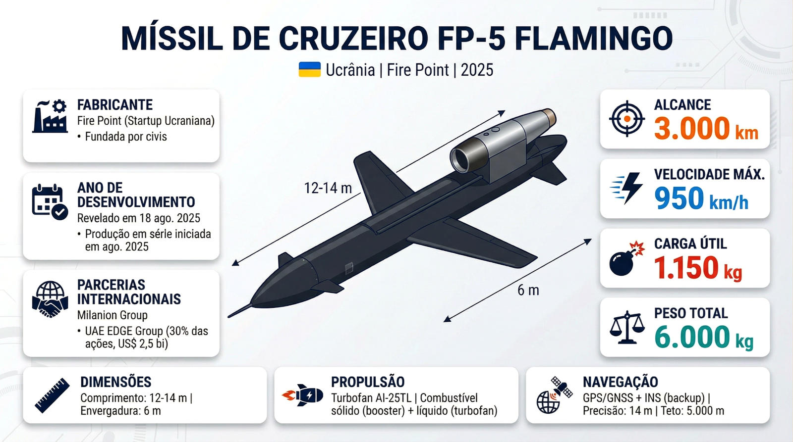 O FP‑5 Flamingo é um míssil de cruzeiro lançado do solo e desenvolvido pela empresa ucraniana Fire Point, que entrou em serviço em 2025 e rapidamente se tornou o principal vetor de ataque de longo alcance produzido pela própria Ucrânia. O presidente Volodymyr Zelensky chegou a descrevê‑lo como “o míssil mais bem-sucedido que temos”, e os ataques recentes demonstram que essa afirmação não é exagerada. O sistema foi concebido para dar a Kiev uma capacidade autônoma de projeção de poder em profundidade, reduzindo a dependência de armamentos ocidentais sujeitos a restrições políticas e ampliando o leque de opções estratégicas disponíveis para o comando ucraniano (Figura 3).