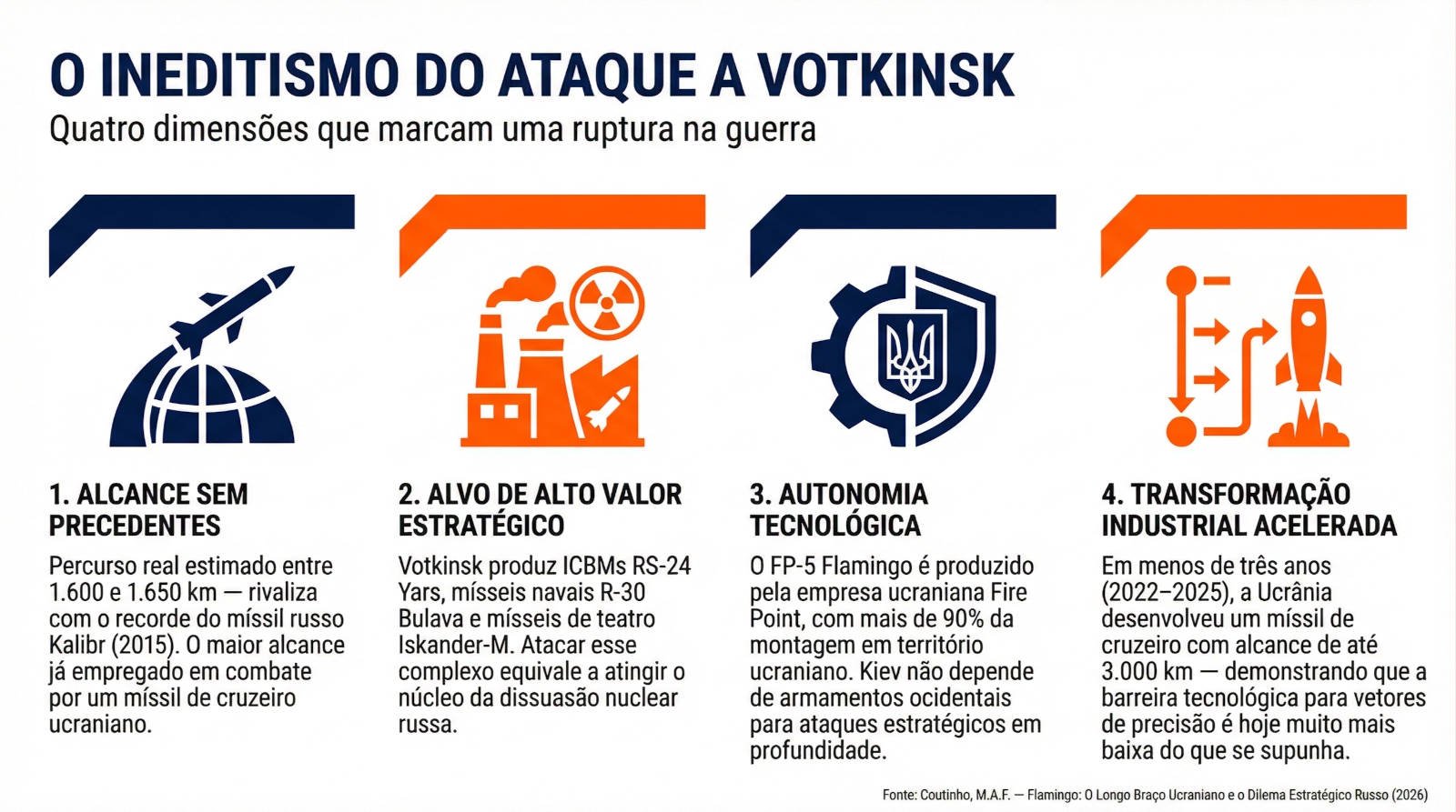 No limite, o dilema russo é aceitar que a guerra entrou em uma fase em que a Ucrânia deixou de ser um teatro periférico e passou a atuar como um ator capaz de projetar poder de precisão sobre o próprio território russo, inclusive sobre ativos ligados à dissuasão nuclear. Essa mudança não decorre apenas do alcance do Flamingo, mas da combinação entre autonomia tecnológica, integração industrial e um perfil de voo que explora lacunas estruturais da defesa aérea russa. O ataque a Votkinsk torna evidente que a profundidade geográfica, por décadas tratada como um escudo natural, já não garante a segurança que Moscou sempre presumiu.
