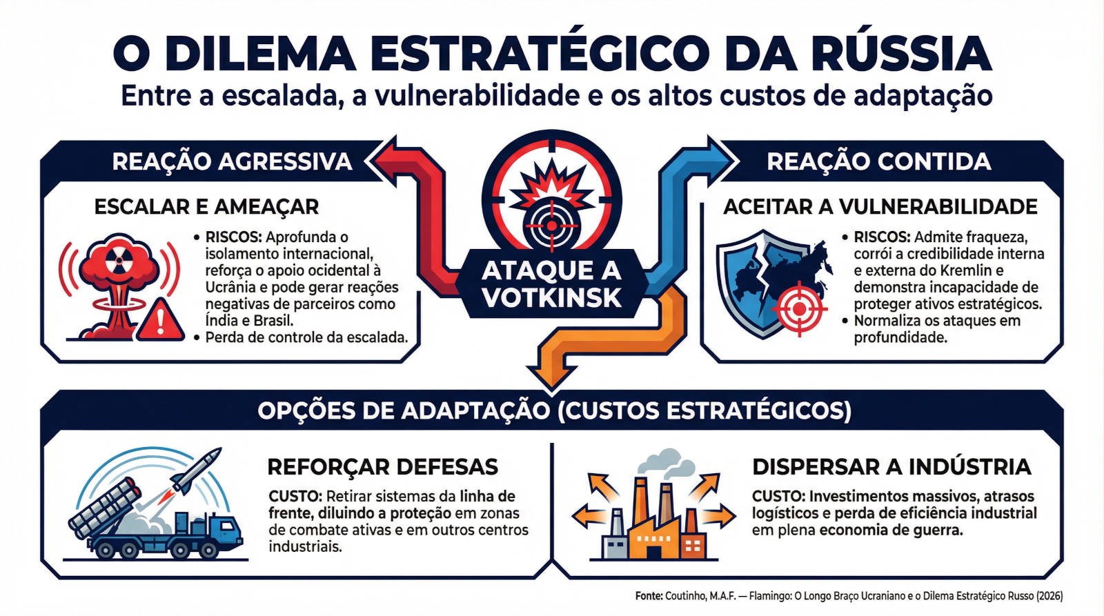 O emprego do Flamingo coloca Moscou diante de um dilema que não é apenas militar, mas também político e doutrinário. A Rússia sempre tratou sua infraestrutura estratégica como intocável, tanto pela profundidade geográfica quanto pela crença de que nenhum adversário convencional teria meios para atingi-la. O ataque a Votkinsk rompe essa suposição e força o Kremlin a decidir como reagir sem comprometer sua própria posição internacional ou desencadear uma escalada que não pode controlar.