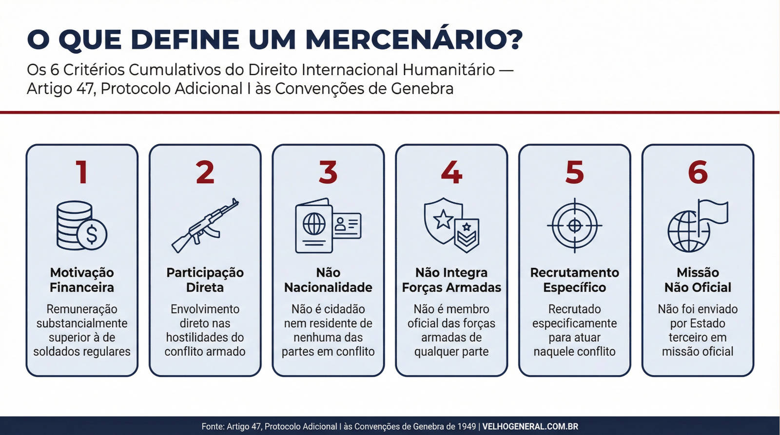 Critérios Cumulativos para a Definição de Mercenário segundo o Direito Internacional Humanitário (Artigo 47, Protocolo Adicional I às Convenções de Genebra de 1949).