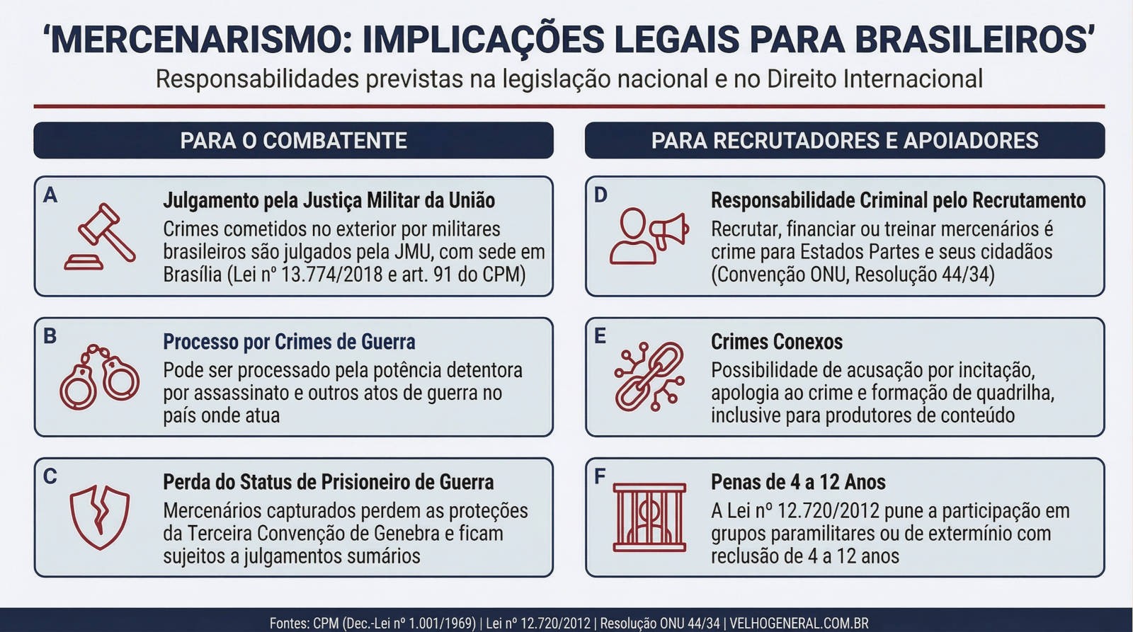 Implicações legais para cidadãos brasileiros envolvidos com mercenarismo, abrangendo combatentes, recrutadores e apoiadores, com base na legislação nacional e em convenções internacionais.