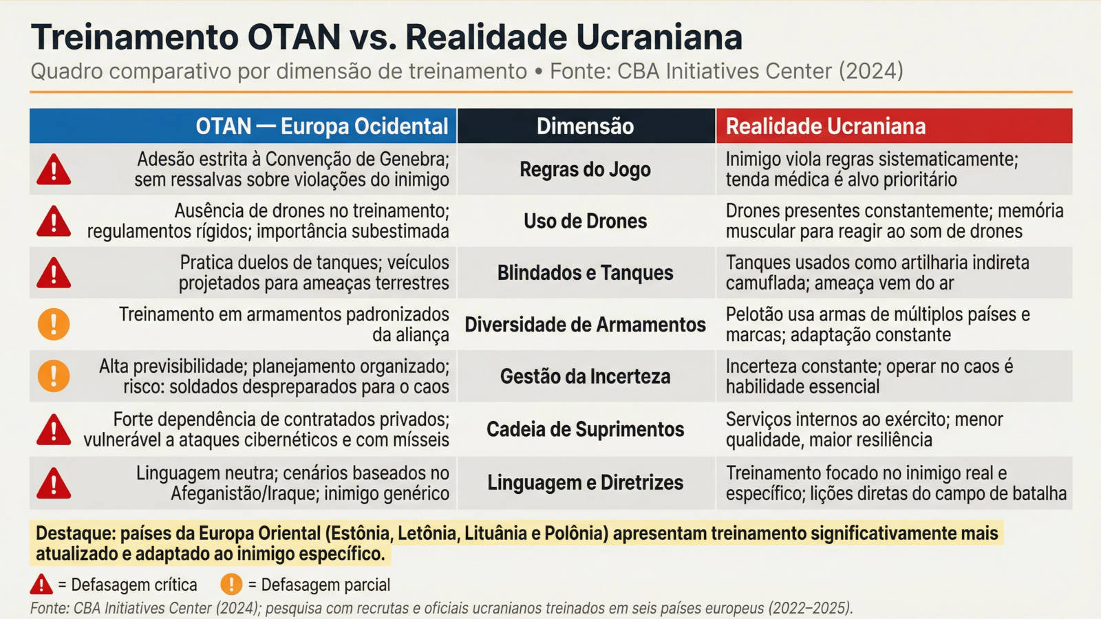 Comparativo em sete dimensões entre as práticas de treinamento da OTAN na Europa Ocidental e as exigências do campo de batalha ucraniano. Em cinco das sete dimensões, identificou-se defasagem crítica nos programas ocidentais. Países da Europa Oriental (Estônia, Letônia, Lituânia e Polônia) apresentam treinamento significativamente mais atualizado (CBA Initiatives Center, 2024; pesquisa com recrutas e oficiais ucranianos treinados em seis países europeus, 2022–2025).