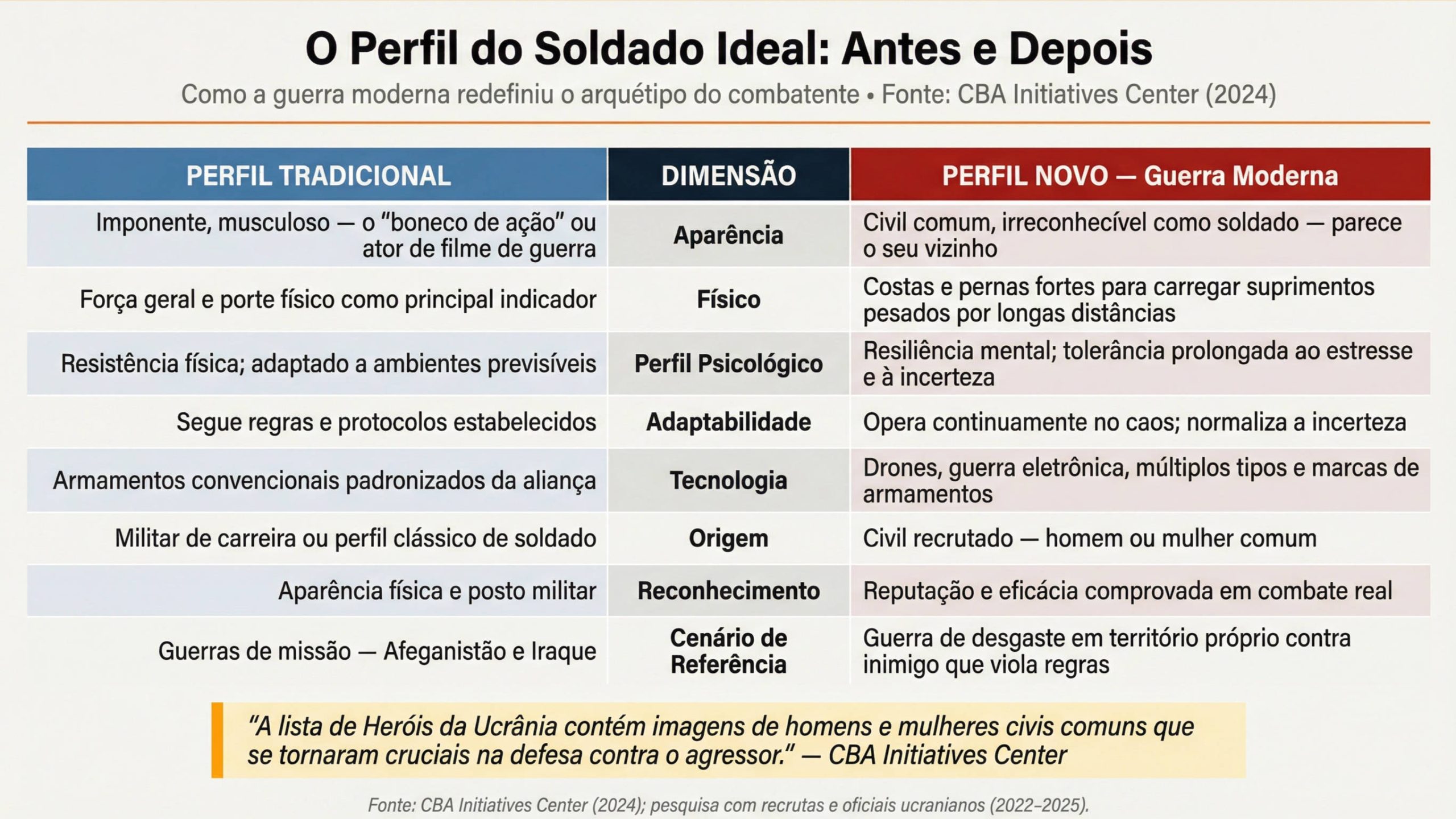 A guerra moderna redefiniu o arquétipo do combatente em oito dimensões: da aparência física à origem civil, da resistência muscular à resiliência mental, do domínio de armamentos padronizados à adaptação ao caos e à tecnologia de drones (CBA Initiatives Center, 2024; pesquisa com recrutas e oficiais ucranianos, 2022–2025).
