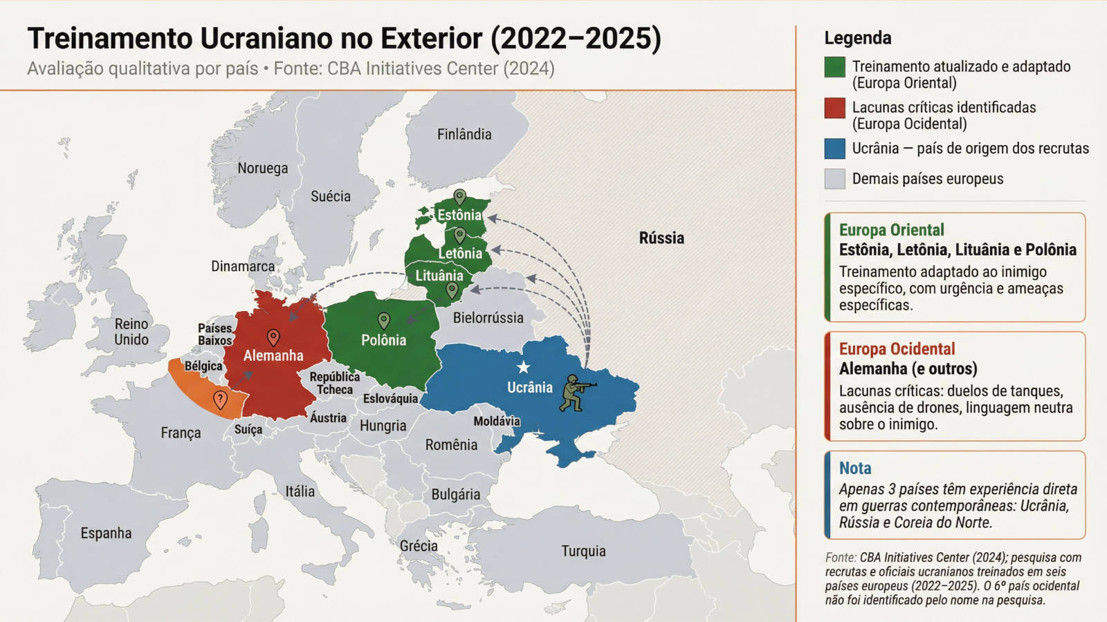 Os países da Europa Oriental – Estônia, Letônia, Lituânia e Polônia – apresentaram treinamento adaptado ao inimigo específico. A Alemanha, único país ocidental identificado pelo nome, concentrou as lacunas críticas descritas na pesquisa. O sexto país ocidental não foi nomeado (CBA Initiatives Center, 2024).