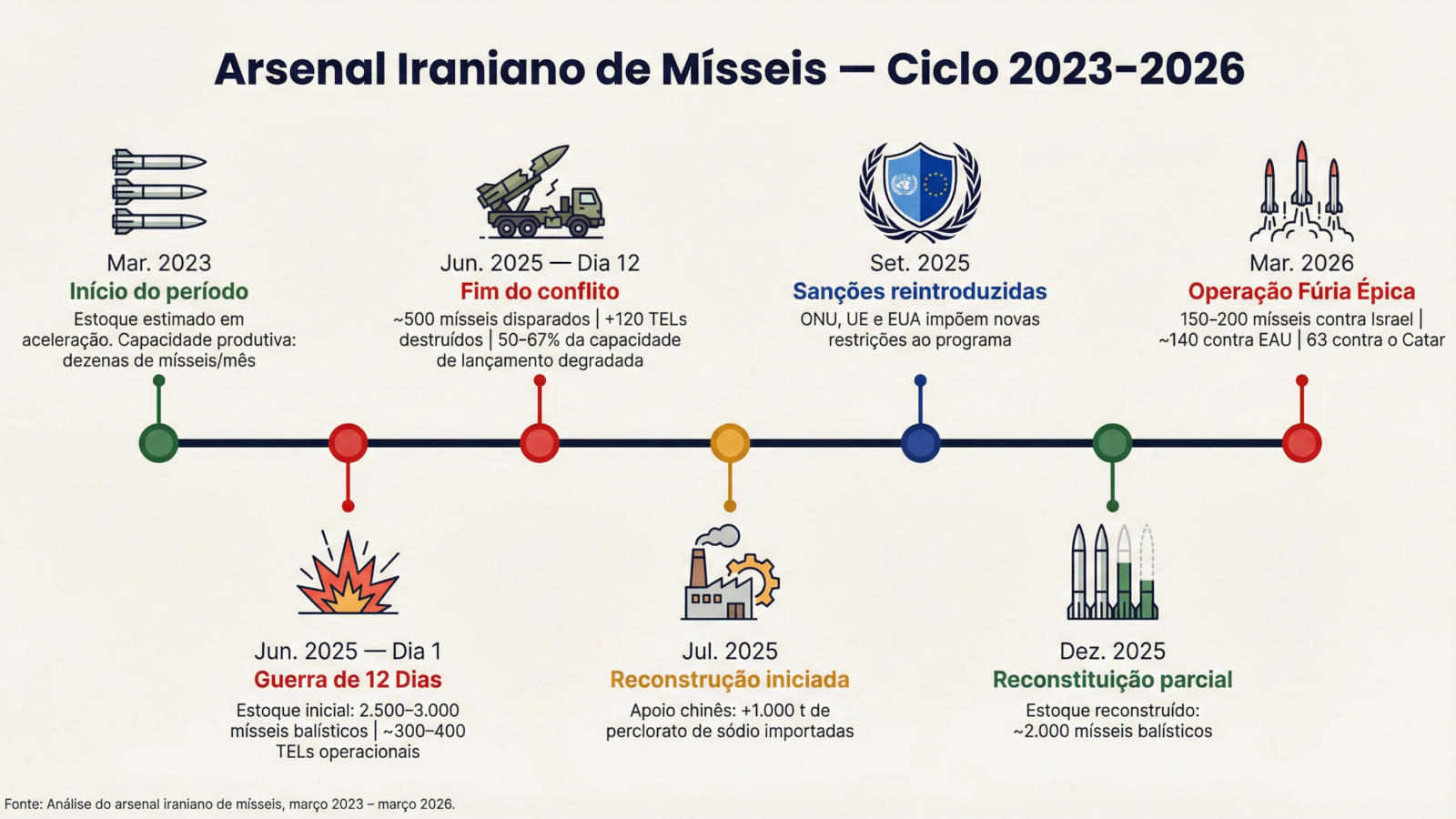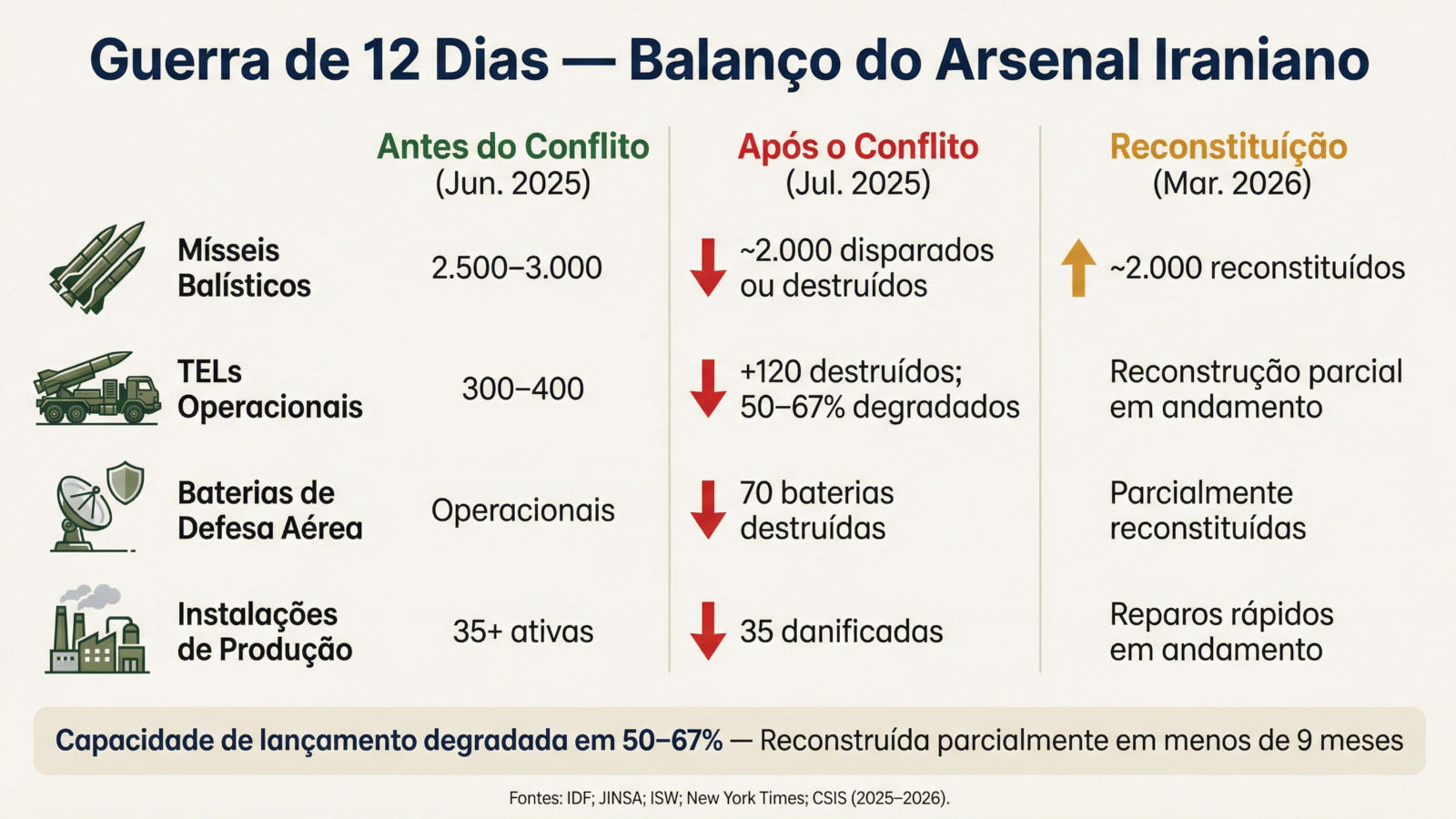 O arsenal de mísseis e lançadores iranianos passou, entre 2023 e 2026, por uma transformação dramática: de um programa em aceleração pré-conflito, para uma capacidade severamente degradada e, em seguida, para uma recuperação talvez parcial, mas substancial. A Guerra de 12 Dias de junho de 2025 demonstrou o alcance do programa – o Irã foi capaz de saturar as defesas israelenses com centenas de mísseis.
