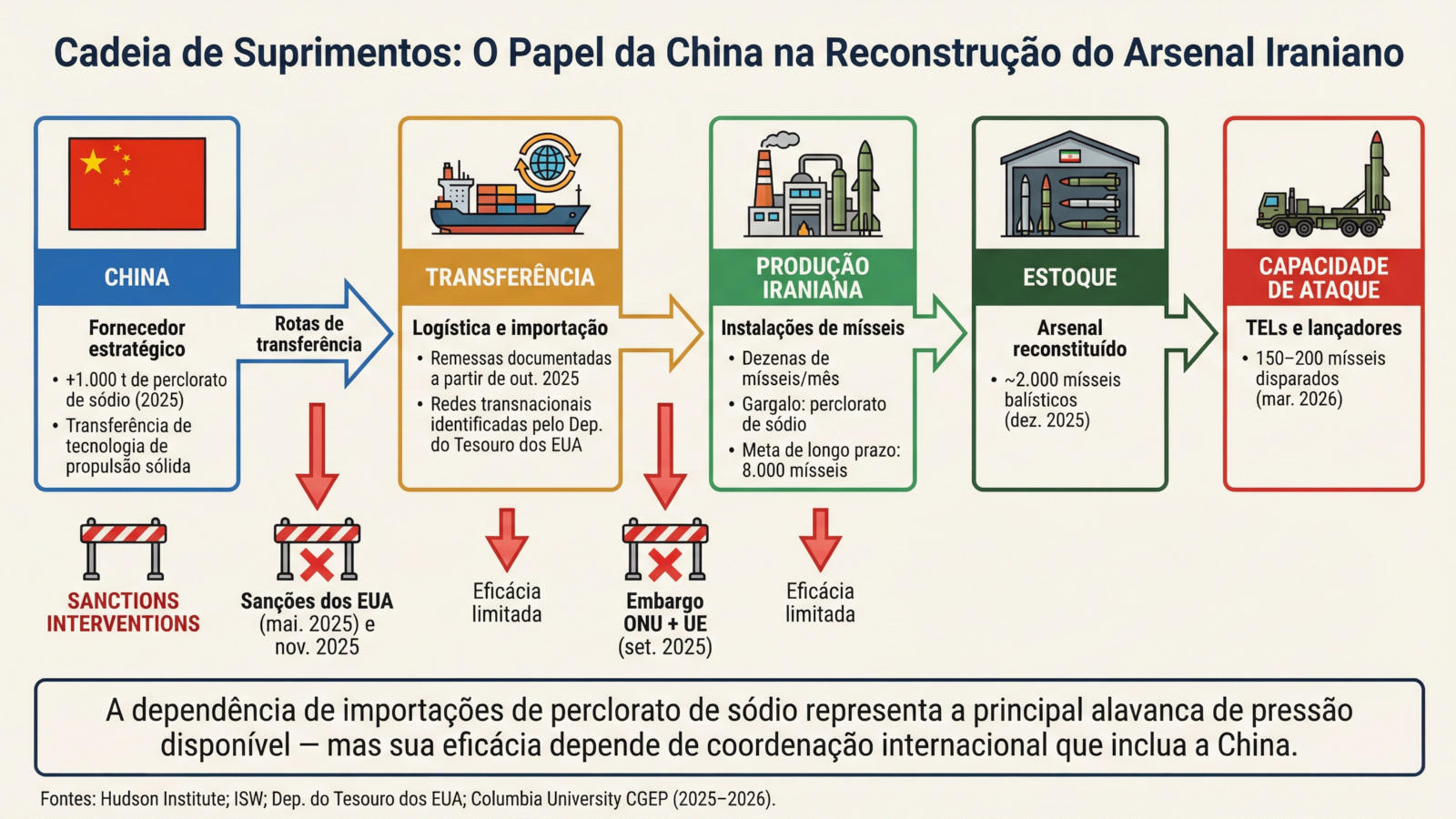 O papel da China como fornecedor de insumos críticos e tecnologia representa um fator estrutural que limita a eficácia de sanções. O Hudson Institute e o Asia Times documentaram que a China forneceu mais de 1.000 toneladas de perclorato de sódio ao Irã em 2025, apesar das sanções, configurando o que o Hudson Institute denominou uma dimensão sino-iraniana do conflito.